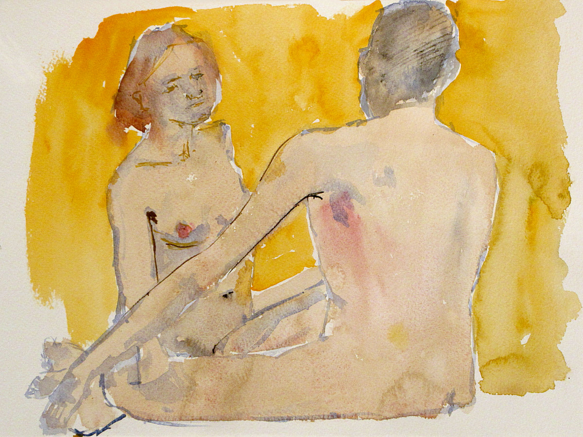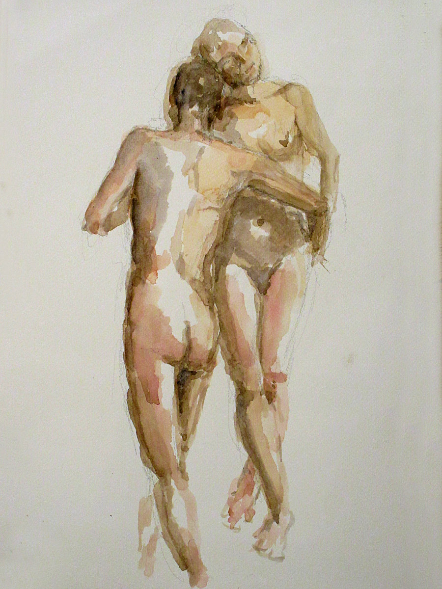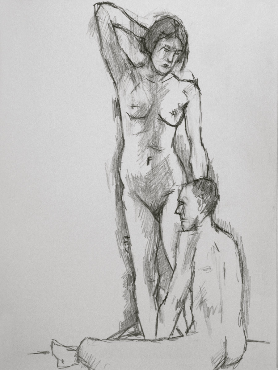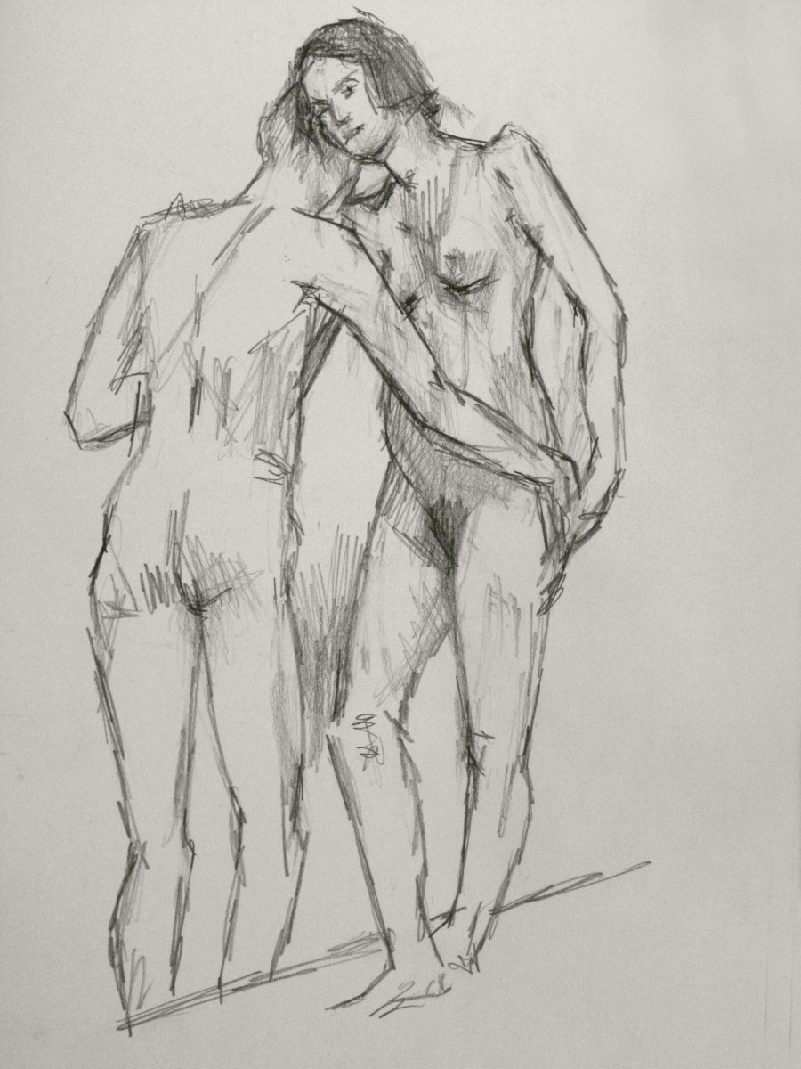 Once again we’d been booked to provide four 30-minute duo poses. We arrived early, with time enough to practice a few nude combinations on our central bench. For the artists surrounding us this may have whet the appetite or bred frustration, depending on where they had set-up their easels in relation to the angles we presented. No-one shifted, however, so we began with a standing embrace that eventually found its way to the exhibition.
