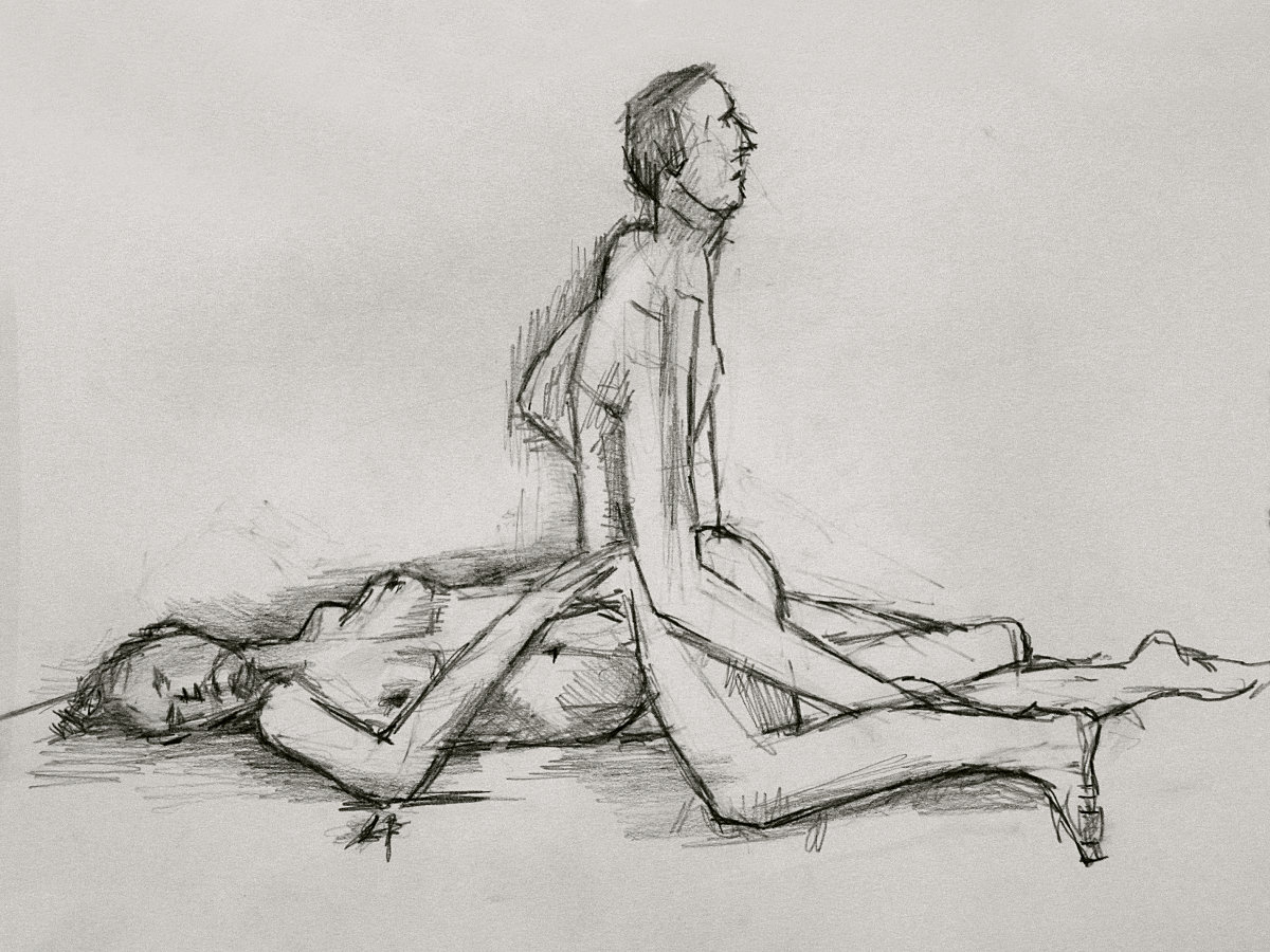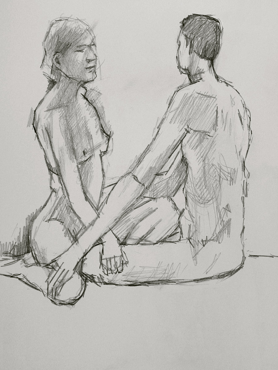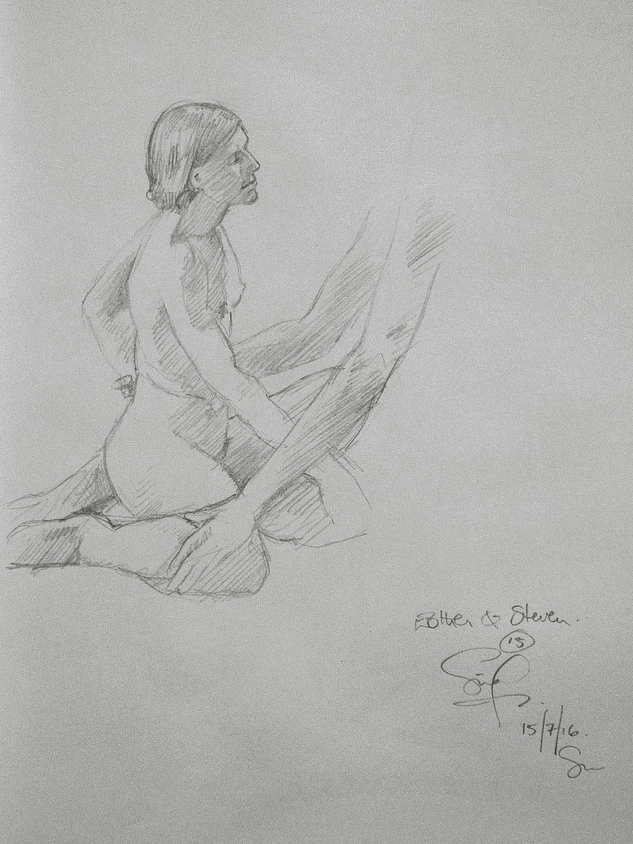 For our second half-hour, Esther lay down with a twist and I sat alongside her, facing in the opposite direction. This lasted until the 15-minute interval for tea, biscuits and some socialising. Our third pose was intended to be relatively simple with the two of us seated facing one another with a look of love. The temptation is always to add an extra degree of stretch for the artists, however, and the price this time was a quickly numbed leg for my partner.