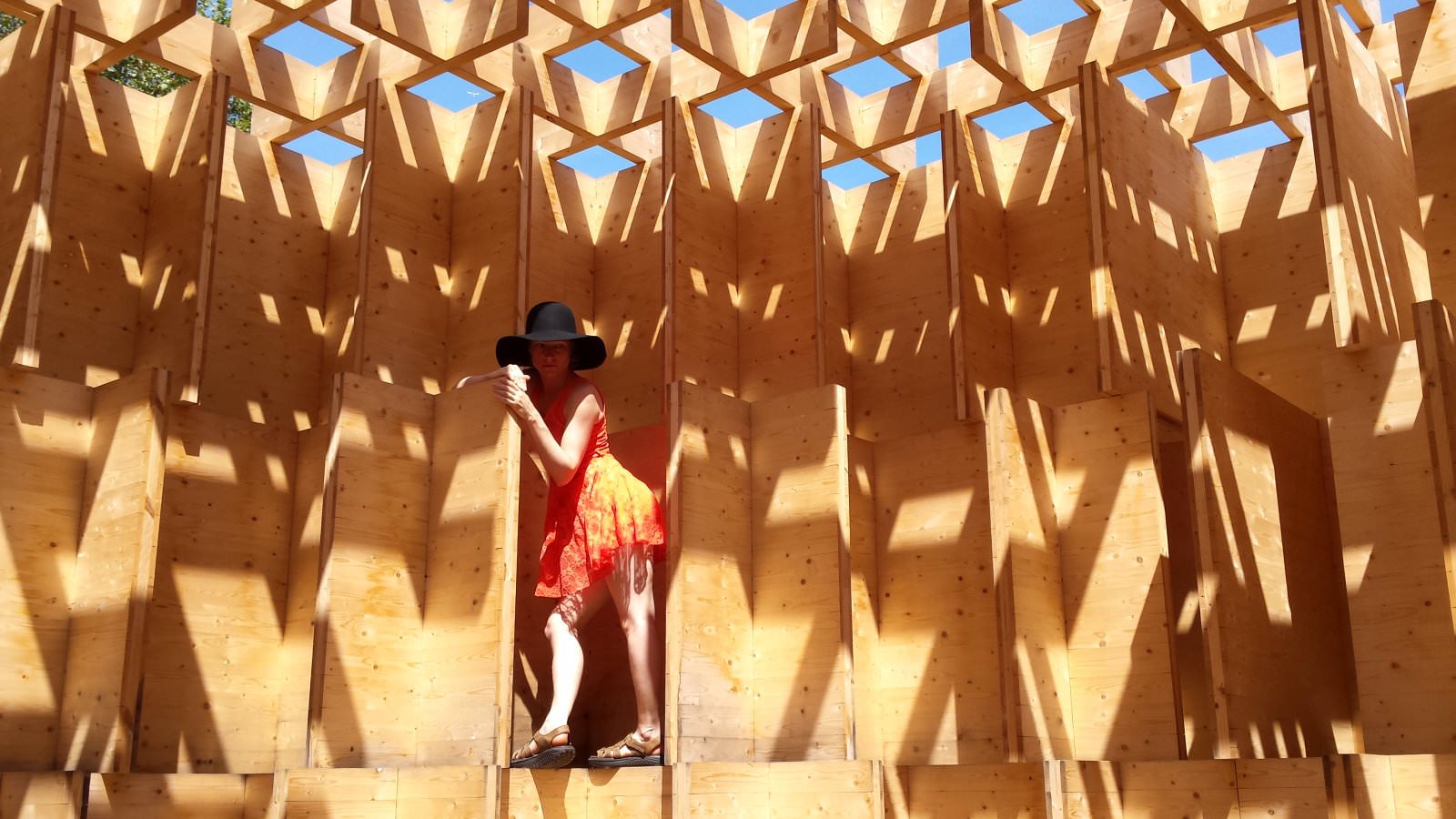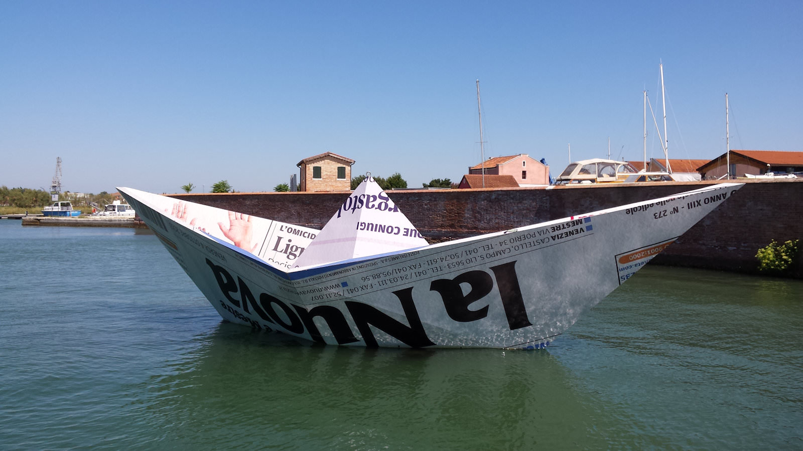 After a long lay-in we took brunch of toasties at a café on via Guiseppe Garibaldi. We sat outside, shaded from the ferocious midday heat by umbrellas and cooled by a fan that blew mists of water vapour upon us. Esther bought fresh fruit and vegetables from a market trader whose goods were stacked across a boat moored permanently at the head of the adjacent canal. We topped up supplies at the local Coop, then headed to Giardina, stopping to take photos at The Forests of Venice installation by Kjellander + Sjöberg & Folkhem – our first close encounter with art on this trip.