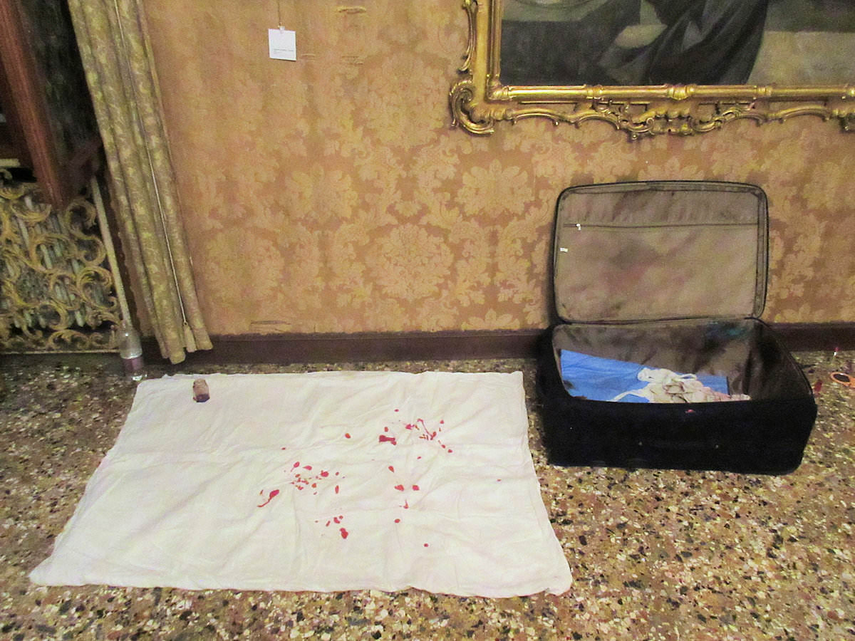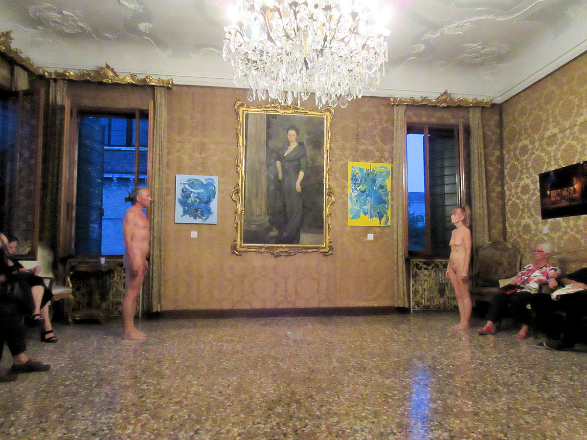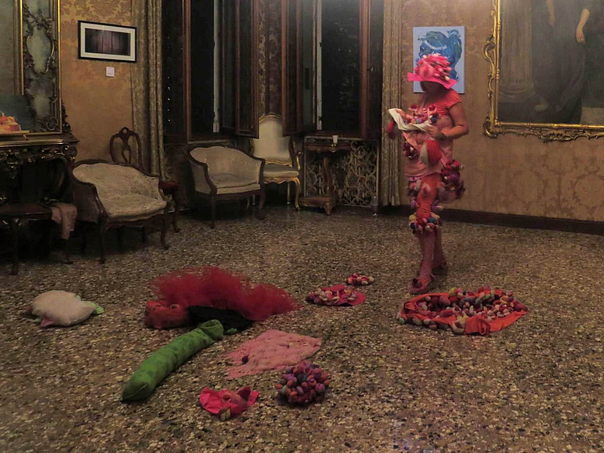 We found Ca’ Zanardi in chaos. We were neither greeted nor spoken to by the event’s curators – perhaps we represented failure and must, therefore, be shunned – and their intern staff were struggling to cope with an organisational overload. There was little we could do, except watch the artists already booked for this venue and await our chance to perform afterwards. We’d missed the opening performance, so the first we saw was Hannah Berestizhevsky presenting ‘Heart Cramp‘ in the Palazzo’s gold room. Then came the turn of Glynis and Peter to perform ‘Foil‘ in same magnificent space.
