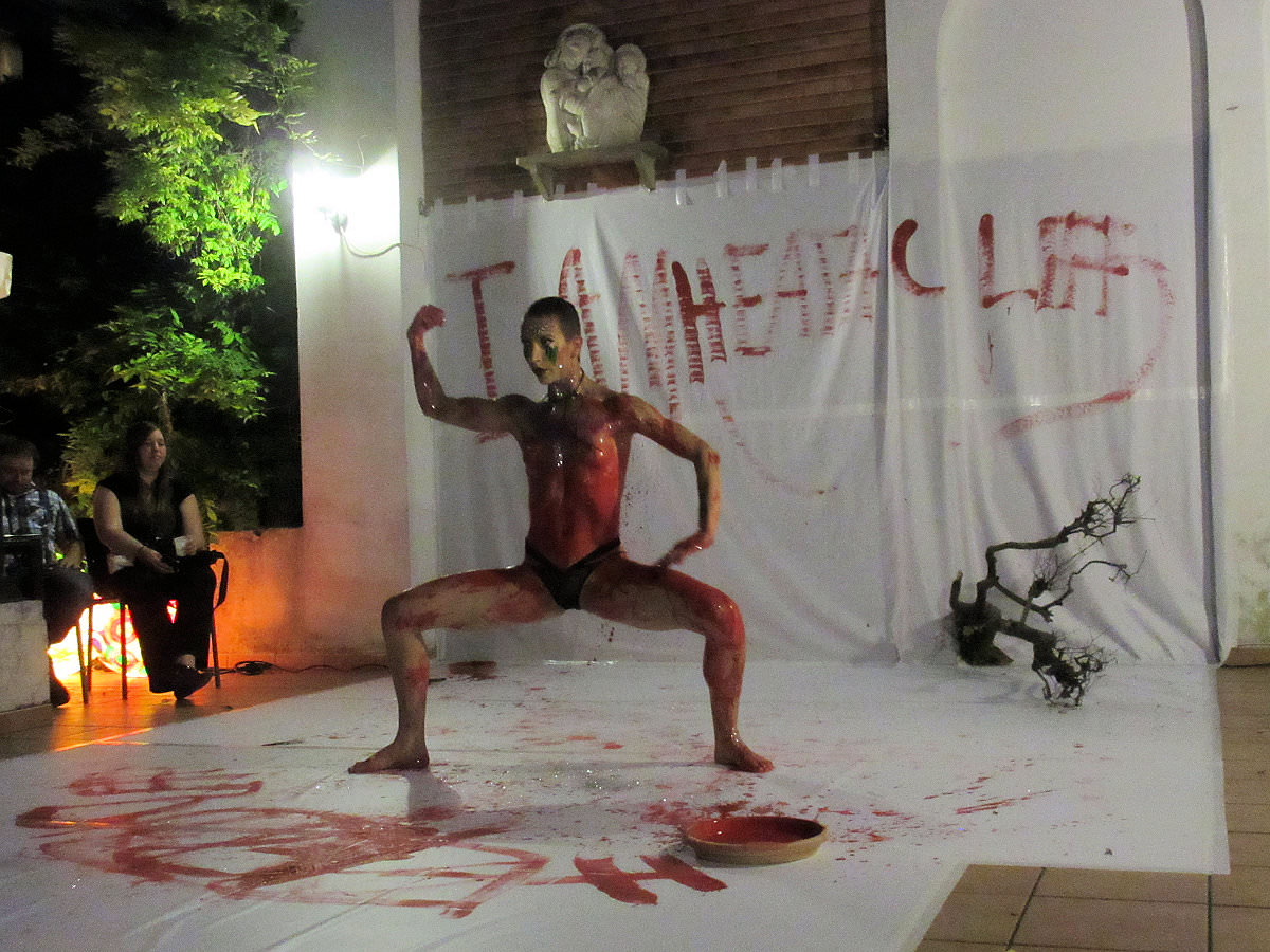 We took sunset photos then retreated to consider our next move. I had a deep sense of foreboding; staff were willing to slot us in at 10:30pm, between a singer and DJ set, yet to me it seemed the wrong performance at the wrong time for the wrong audience. We would be confronting them with nudity, blood and body paint, to a soundtrack that included The Fall, Dead Can Dance and Skinny Puppy. It’s unlikely this is what diners in cocktail dresses and evening suits would be anticipating. I felt certain of a negative reaction, without sufficient positives at an artistic level for it to be worth the trouble.