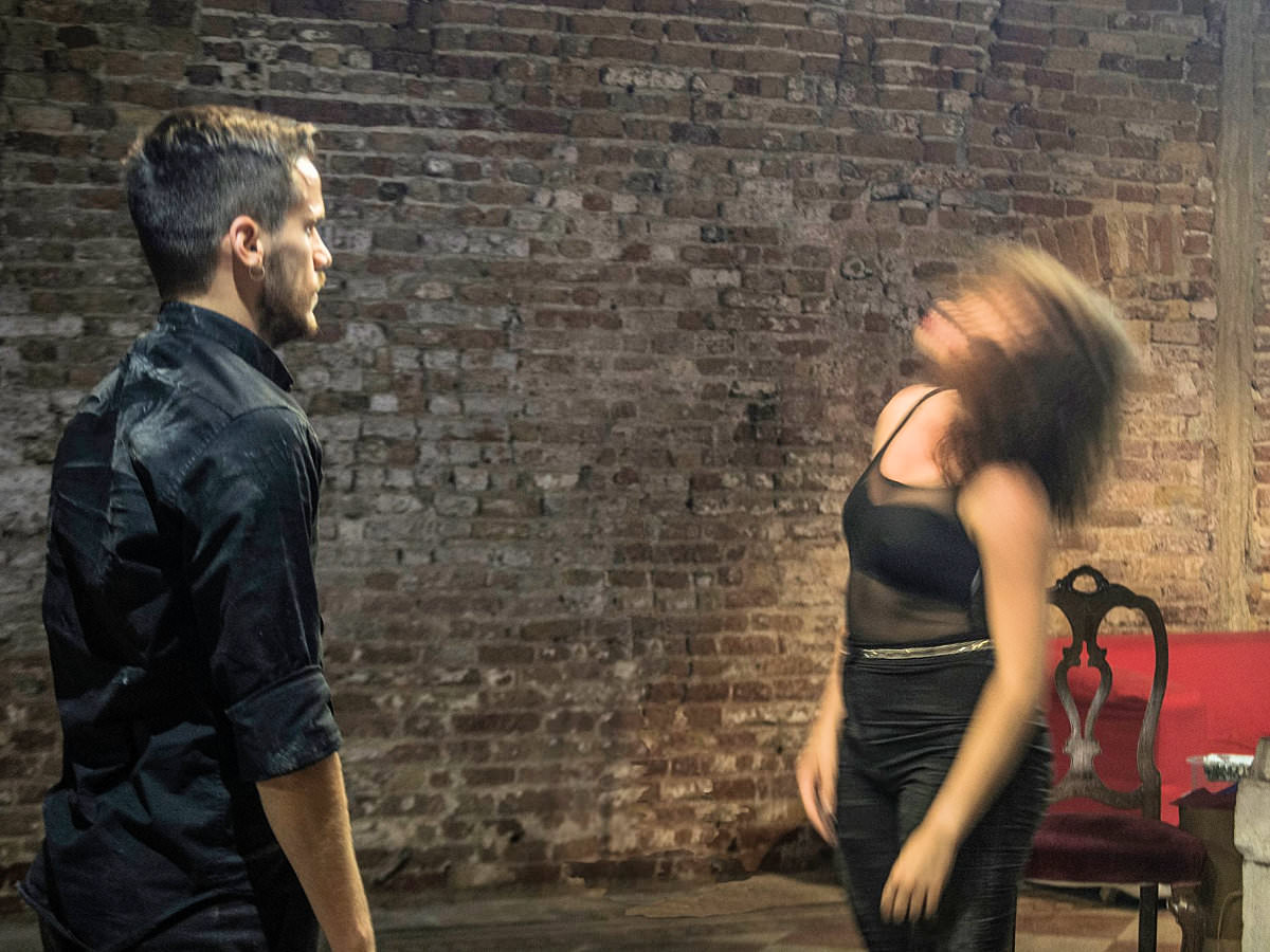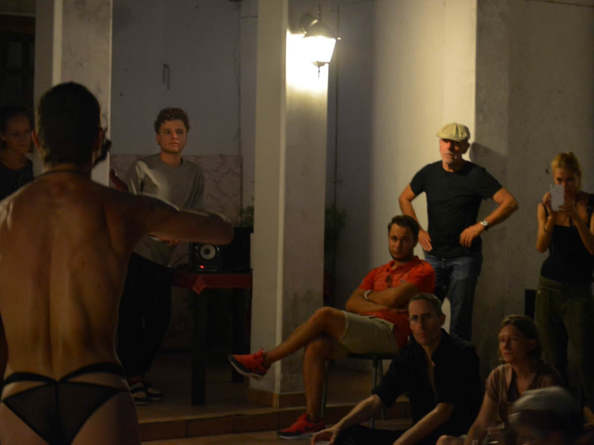 Joss Carter emerged in white paint, loin cloth and chains to begin shuffling about the building, meekly inviting guests to take a paper-wrapped stone from a small bag. Out on the balcony, Elisabeth van Dam drew the largest crowd for her impressive dance piece, ‘Wuthering‘. We were then led down to the courtyard, where duo Hypnogogia were to perform – by now the audience had thinned, and was predominantly made up of other artists. When Joss completed his howling extract of ‘Salvation‘ on the lower floor, it meant the relocated Venice Art House performances could – at last – begin.