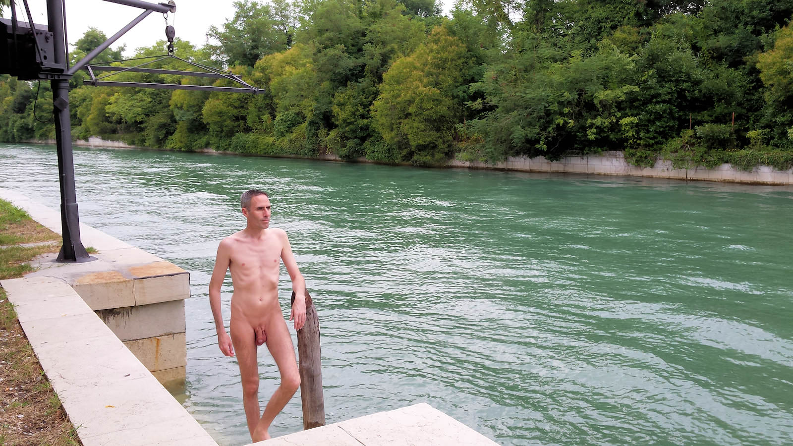 Needless to say we didn’t get up early. It was our only day with rain predicted, but not until 5pm, so we went by vaporetto to Vignole – an island we’d not visited on either of our previous trips – changing at Fondamenta Nove. We called in first at Trattoria alle Vignole for cappucinos and strawberry tiramisu, then afterwards planned on hiking to Forte di Sant’Andrea, but soon reached the limit of the canalside footpath. So instead we decided on a first impromptu nude photo shoot of the trip, with me semi-immersed in the water of the canal.