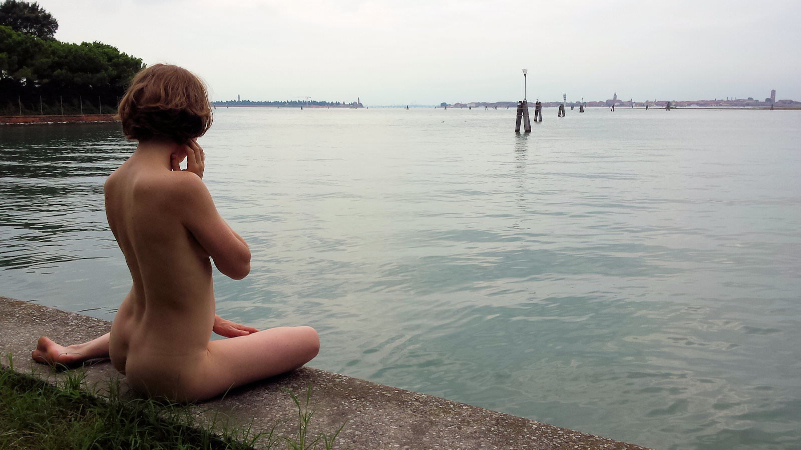 Nowhere else was suitable on this small island, but Esther didn’t mind; she was quite happy simply to have performed her earlier blood ritual – Blood>>>Orange would keep for another day. With such an outstanding backdrop, however, I couldn’t resist a quick nude photo shoot. Not enough people were on San Giorgio for me to care about being seen. As the hour neared eight o’clock, sunset colours added beautiful warming tones to the backdrop. Ever since our first trip to this city I had wanted to try a guerrilla-style nude shoot somewhere unmistakably Venetian and now, at last, I had my moment