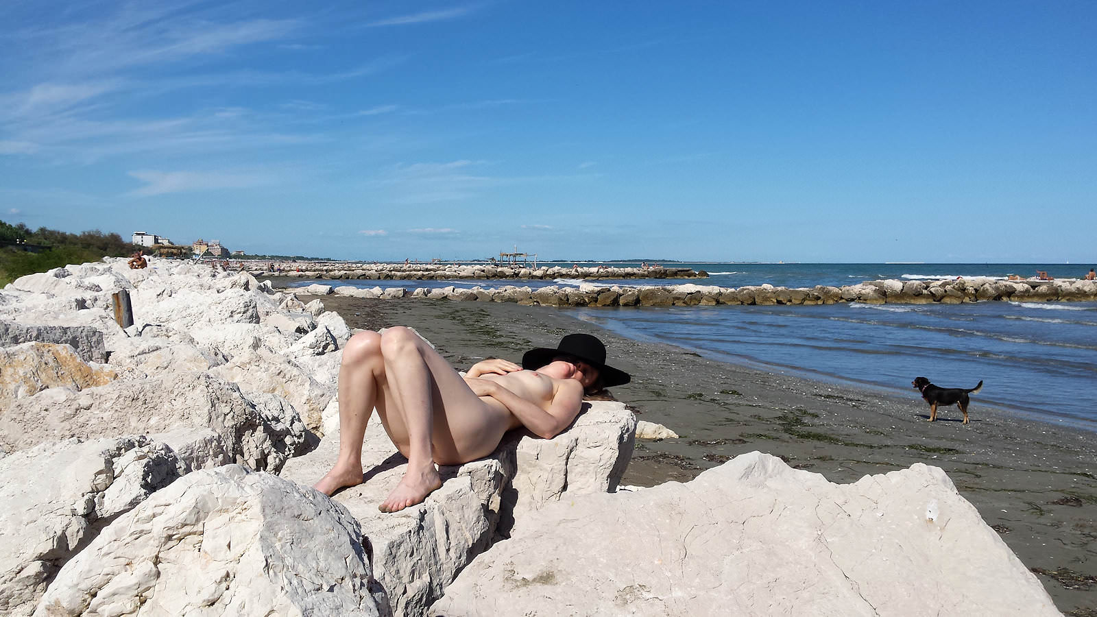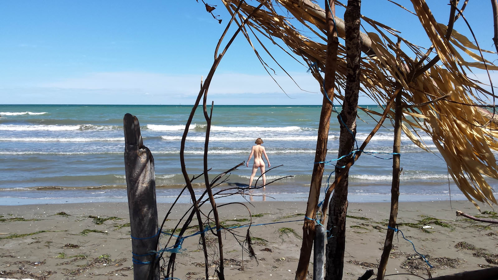 Another late rise was followed by another crossing to Lido and a bus ride further along the island than we had been before. When we were at what we guessed to be roughly the halfway point, we got off and walked to the sea-facing side. We’d gone beyond the sands, so returned to the main road for coffees and a panini at café Tentazioni, before walking a little further and returning to the sea – this time in line with the first beaches. We found a deserted little shack made of driftwood, which offered welcome protection from the direct sunshine, whilst being open to cool breezes on all sides.