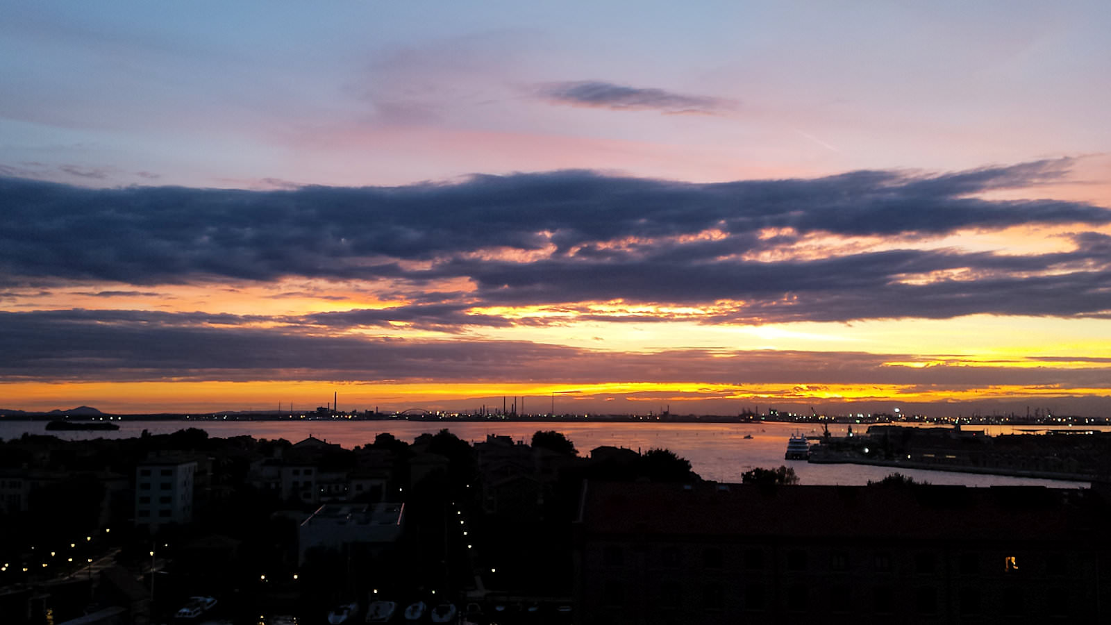 August brought the final instalment in a trilogy of visits to Venice this year, for me and my partner, Esther. Our first visit in winter had brought unexpected connections. Our second came when Esther was invited back by the It’s Liquid group, to perform Girl in Suitcase at Palazzo Ca’ Zanardi in spring. After that success, our third visit was in summer for another performance of Girl in Suitcase, this time at Venice Art House for their ‘Fragmented Identities‘ event, and to present a completely new work called ‘Blood>>>Orange‘ at the Skyline rooftop bar of the Hilton Molino Stucky Venice.