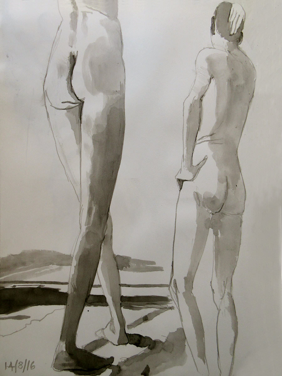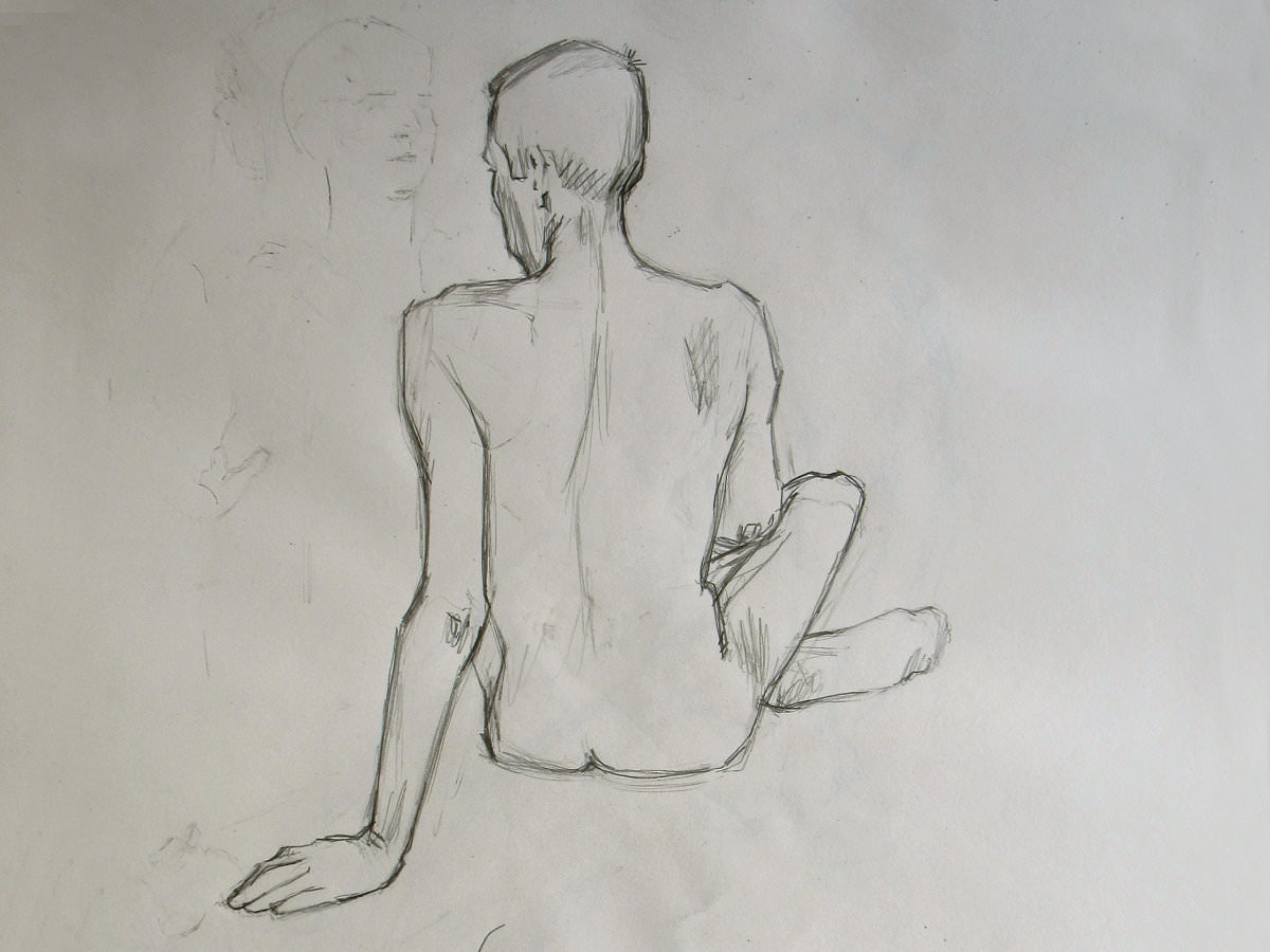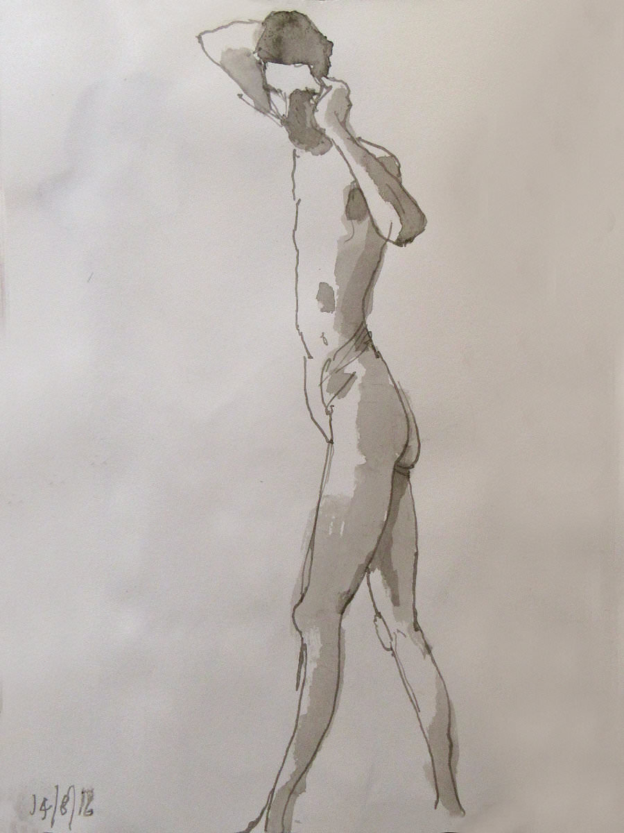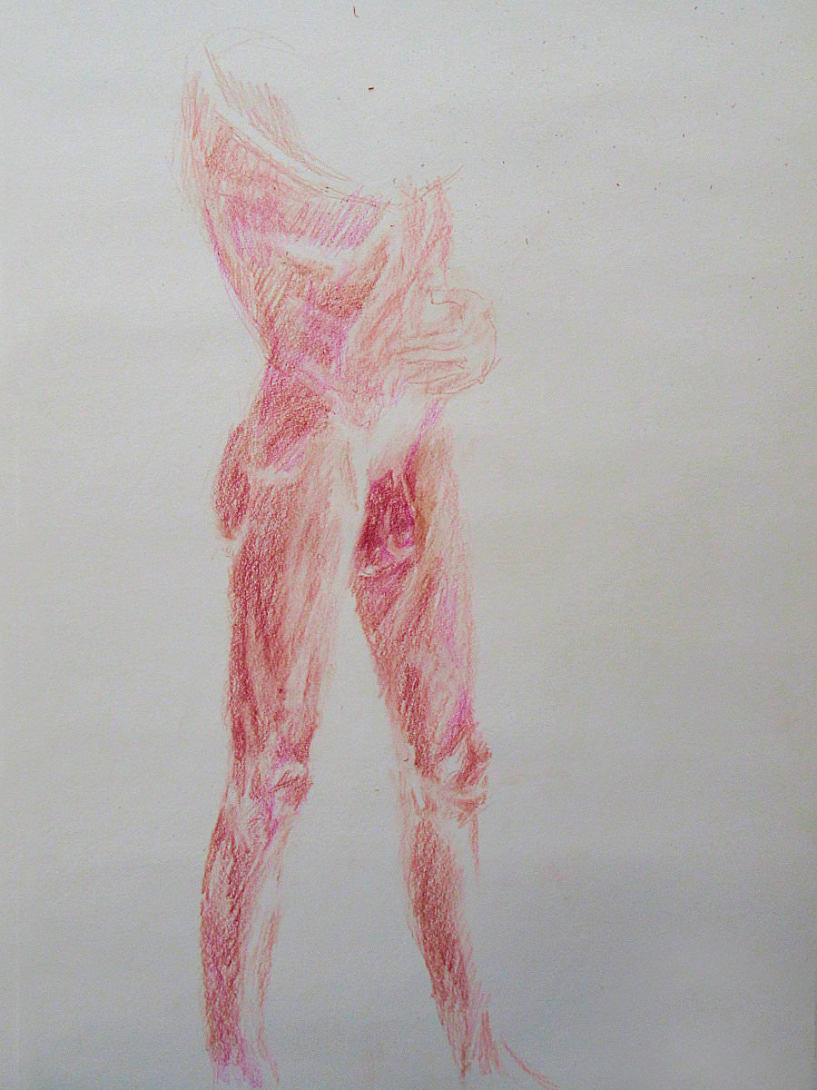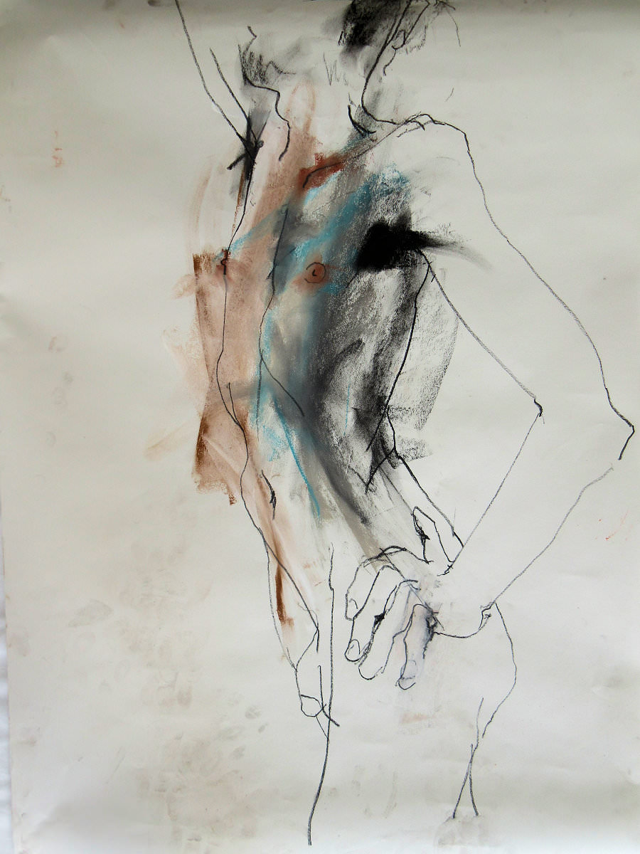 It was a warm Sunday afternoon, but not stiflingly so. I’d arrived at the Dellow Centre early enough to change unhurriedly into my dressing gown and take centre stage in an art room occupied by a dozen or so artists; some were familiar faces, others were first-timers to life drawing. Four poses occupied the first hour, up to our break for tea: 10-minutes standing, 10-minutes kneeling, another 10-minutes standing, and half an hour having a nice lay down.