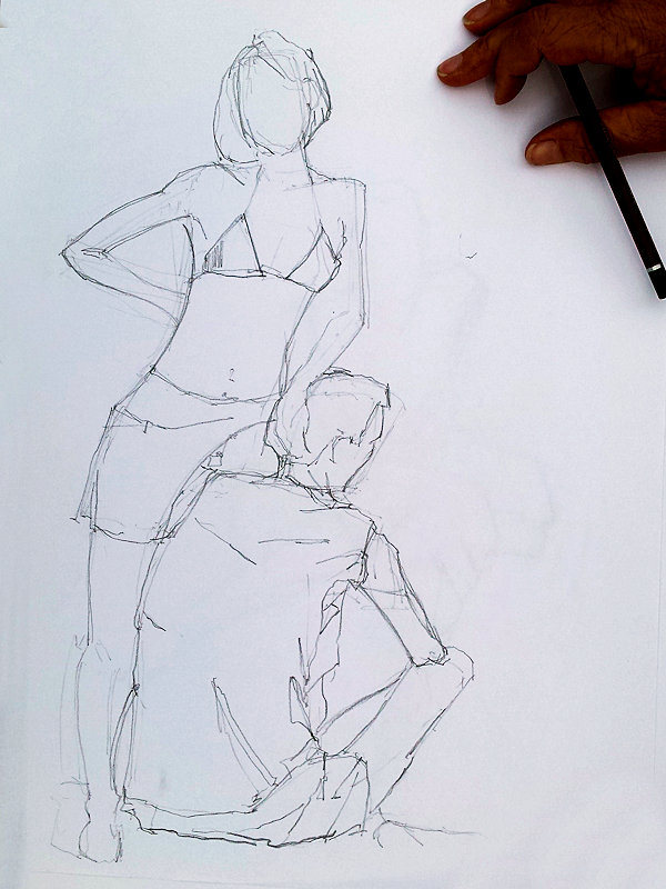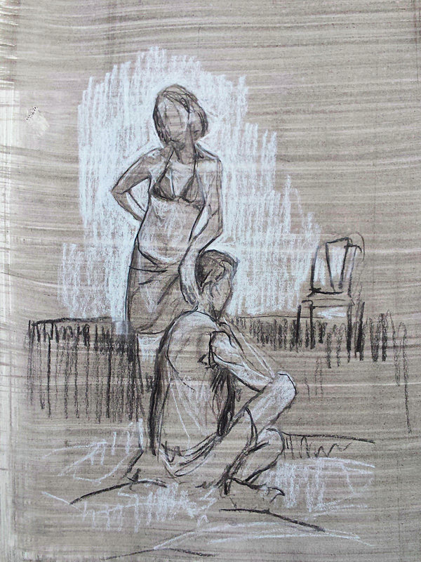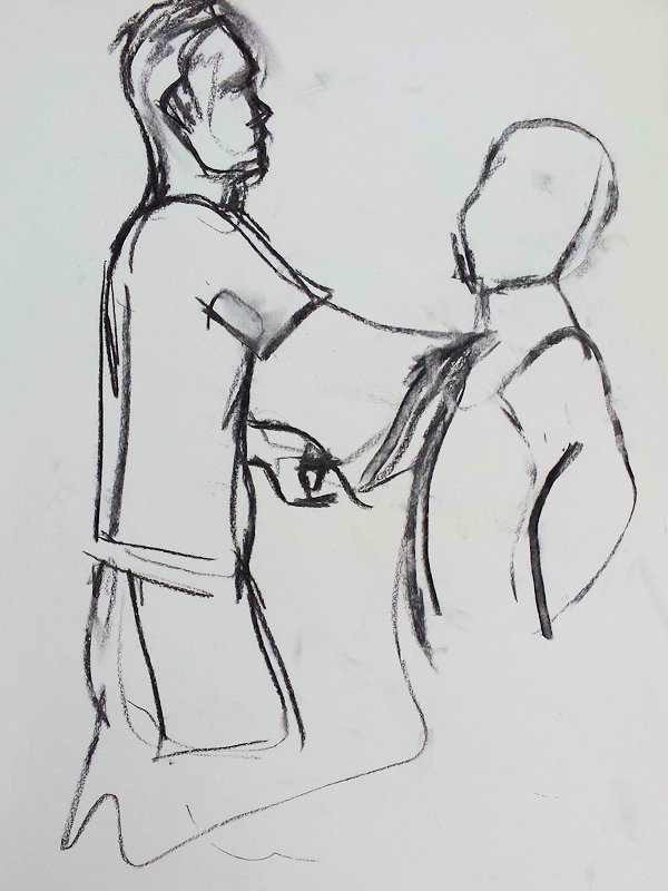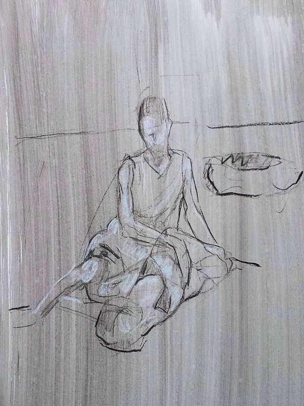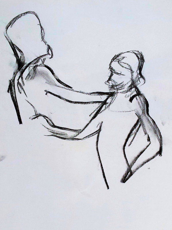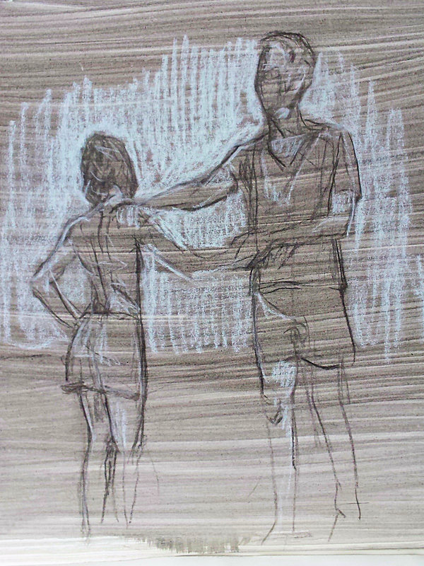 But anyway… to work. We were on the 1pm to 2pm shift, with fellow models Leo and Ian following us from 3pm to 4pm. We began with a back to back pose for 10-minutes, then turned about to face each other with an arm outstretched for 15-minutes. For our third pose, lasting 20-minutes, Esther stood whilst I sat on the floor holding one of her legs. We ended with Esther reclining and me sitting by her side for 10-minutes. Apart from the cover-up nonsense, it was a lovely session on a pleasant day.