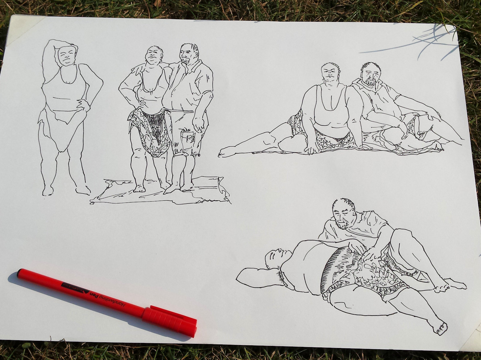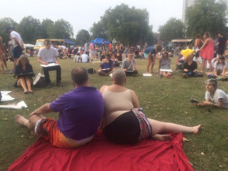 …Esther and I had been invited to be one of two demonstration duos modelling at the Hackney Down Free Festival – an event run by The Star by Hackney Downs pub, where I’ve been a Tuesday night life model on many occasions. It seemed unlikely we could be nude in the centre of an outdoor family fun day so Catherine Hall, who runs Drawing the Star, suggested we pose in our swimwear. Esther stripped to her bikini and I kept my trunks on. No problem… or so we thought.
