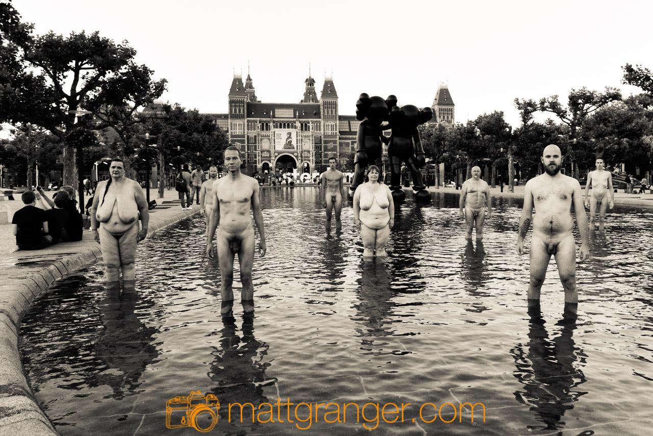 Matt emailed: “about the group nude shoot I have planned for Saturday 1 August, from 9pm. I ask that everyone meets at 845pm at the front of the water fountain […] I want to shoot it at the Rijksmuseum, having people standing like statues in the water, just at sunset […] once the light is right and there is no security nearby, everyone strips, runs in, we shoot in under 10 seconds, then clothes on and leave.