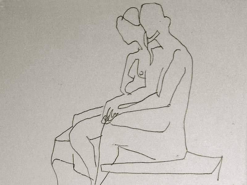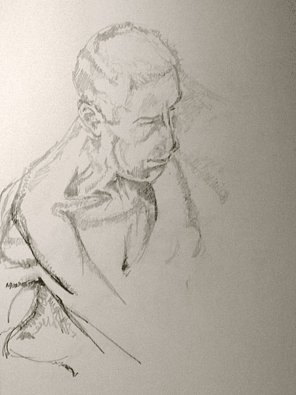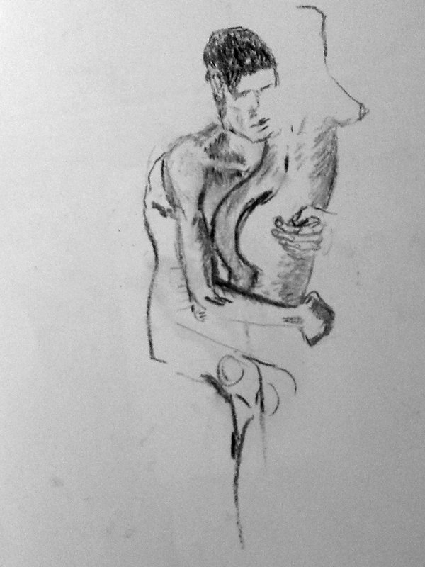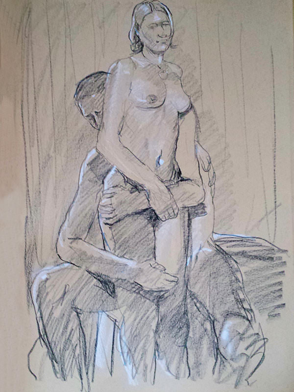 Ideally for a nicely balanced life drawing group, the organisers and models should not outnumber the artists 4:1. That’s how it looked fleetingly when Esther and I arrived at The Finborough Arms for an afternoon of duo modelling. We were welcomed warmly by Aless and Mandy, who run the group, and said ‘hi’ to the then-lone artist seated in one corner. Happily, more joined us.