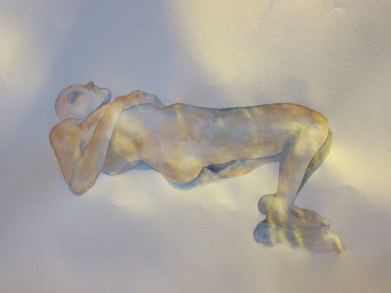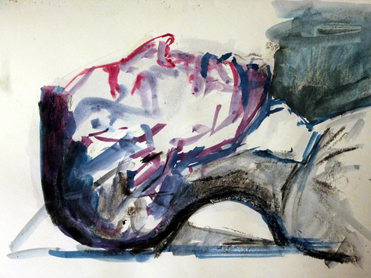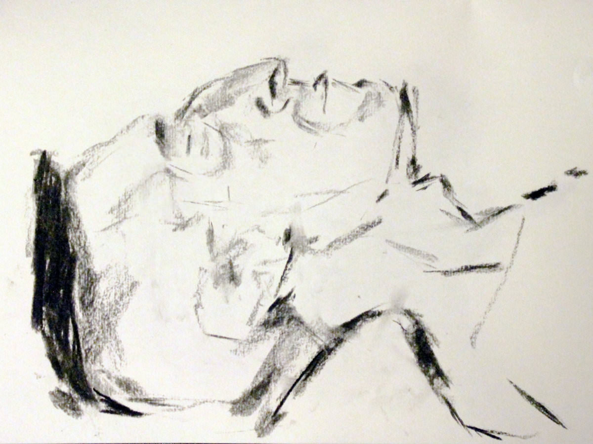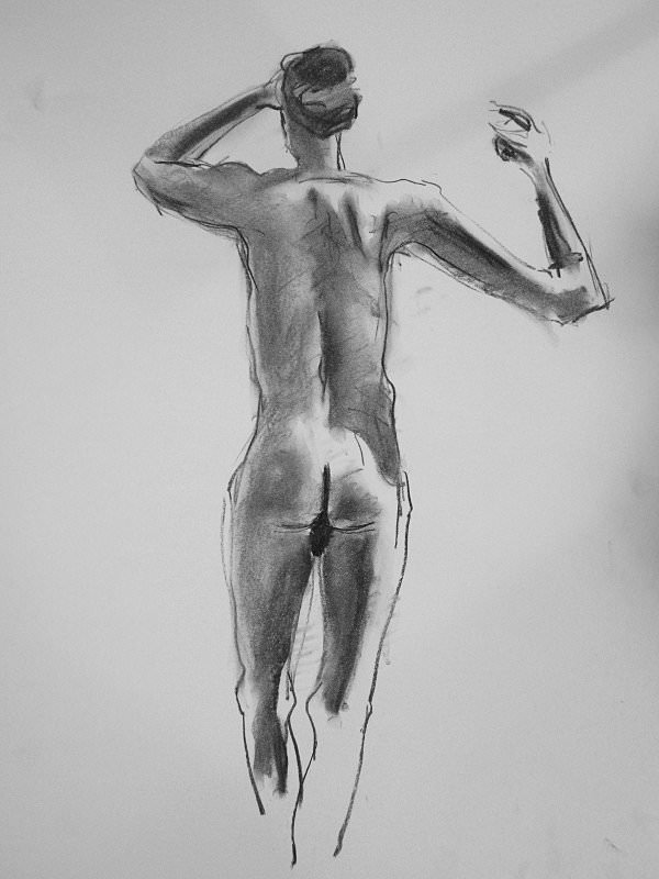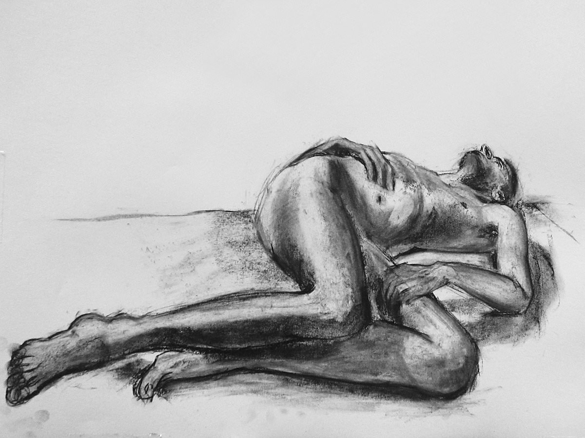 In tutor Victoria Rance, I found infectious enthusiasm for thoughtful, pleasing, natural poses. In this two-and-a-half hour session, she asked if I could start with two poses of 5-minutes and one of 10-minutes, then hold a single long pose to the end. Inspirations were varied; for 10-minutes I would recreate an ancient bronze sculpture, whilst for the long pose I would mimic a drunk she’d seen crumple from sitting to lying face down.
