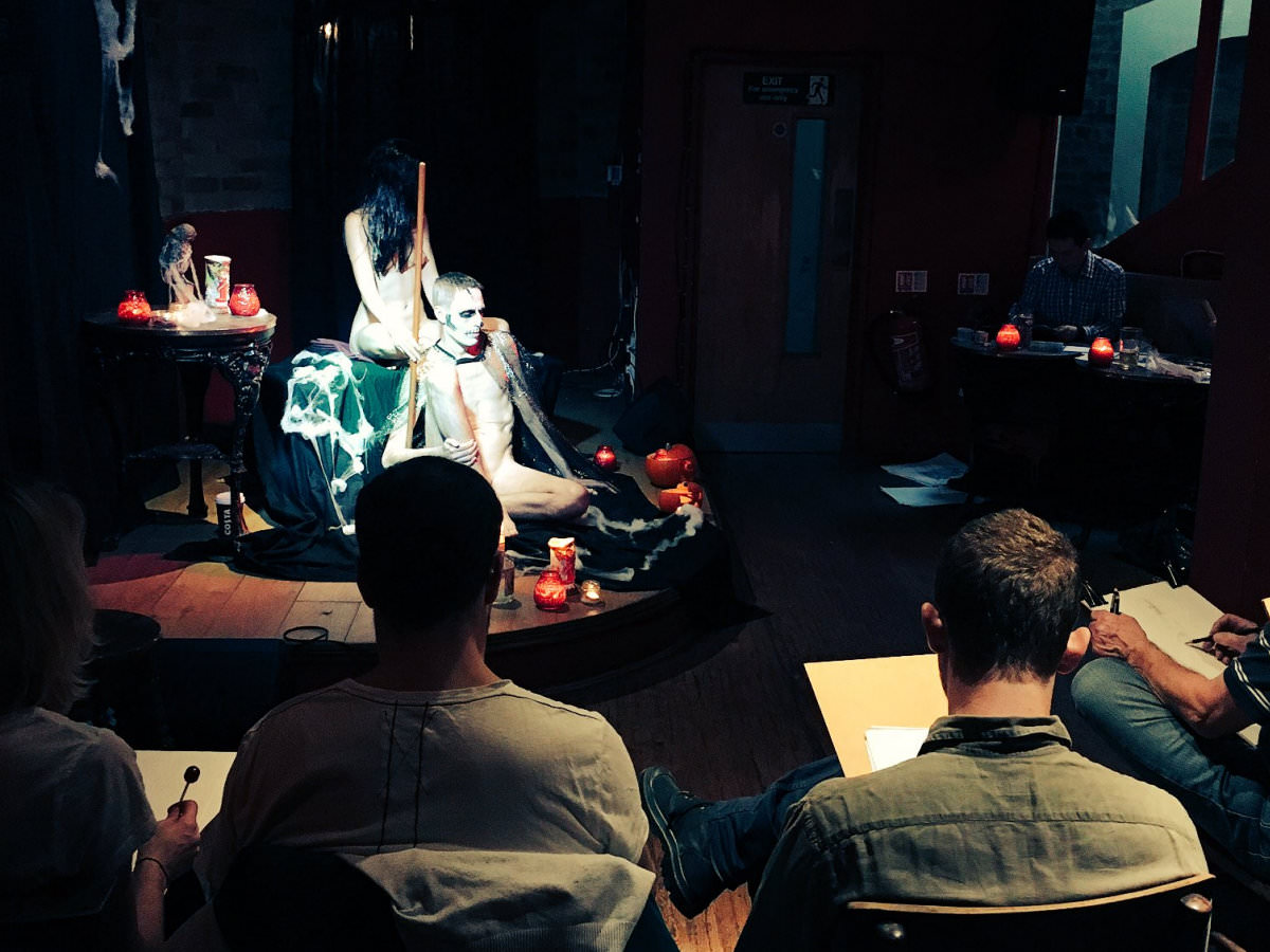 I wish I had a photograph of the sight that greeted me and Esther as we entered The Cellar, beneath The Finborough Arms. Aless and Mandy of The Moon and Nude had not held back in creating a special Halloween life drawing space: a stage draped black and cobwebbed, carved pumpkins with candles at the edges, more candles on all the tables for artists and to one side a delectable buffet of wine, cheeses, biscuits, cakes and chocolate. All it needed was life models, suitably adorned.