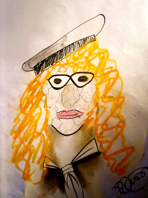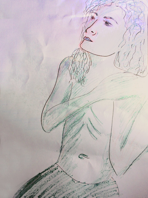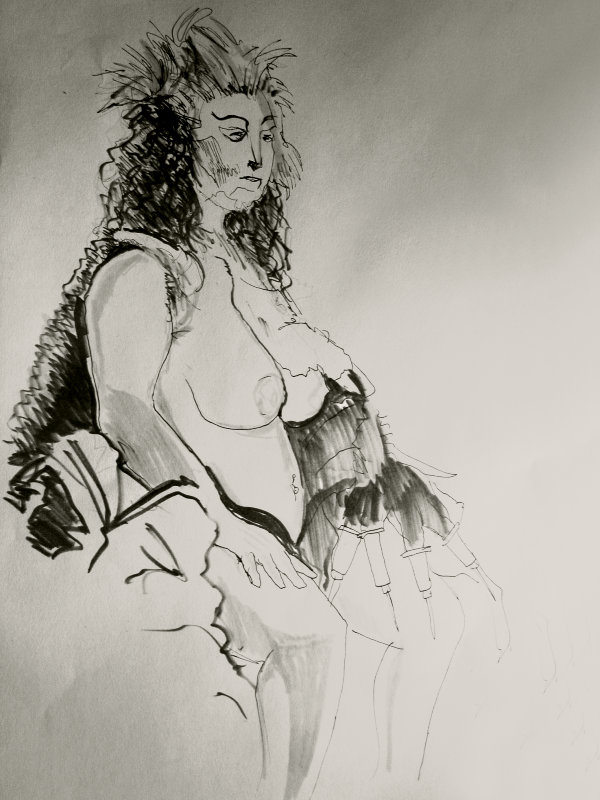 It had been a fun session. Nikki garnered applause for her models, and I reciprocated. Then came the chance to admire the artworks and attempt to photograph them in the dingy mottled light of the bar. After the artists left, we sifted through a pile of drawings that remained abandoned. We were rather taken aback when the one below surfaced. Ahh, maybe it was by the barman who walked in on my preparations…