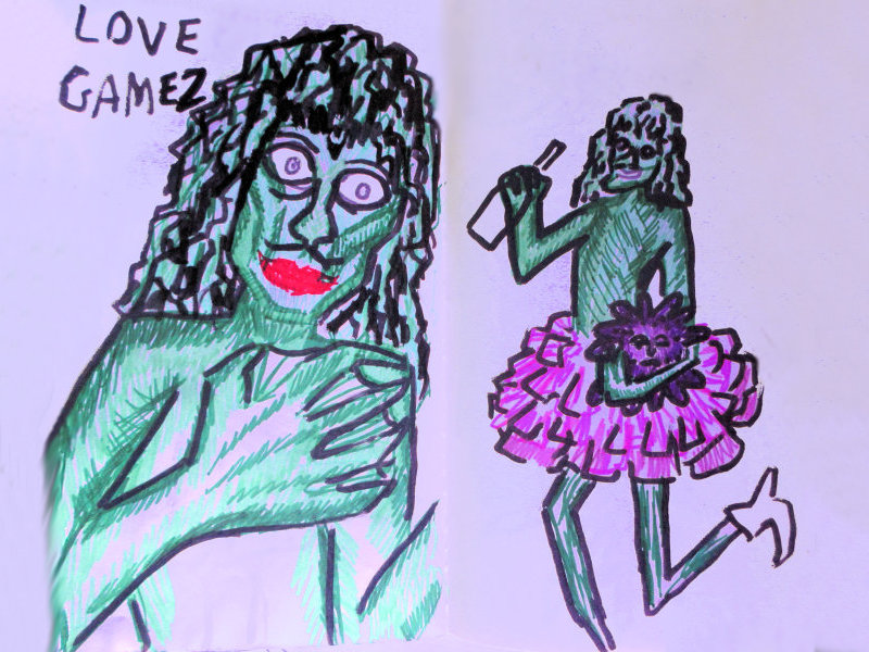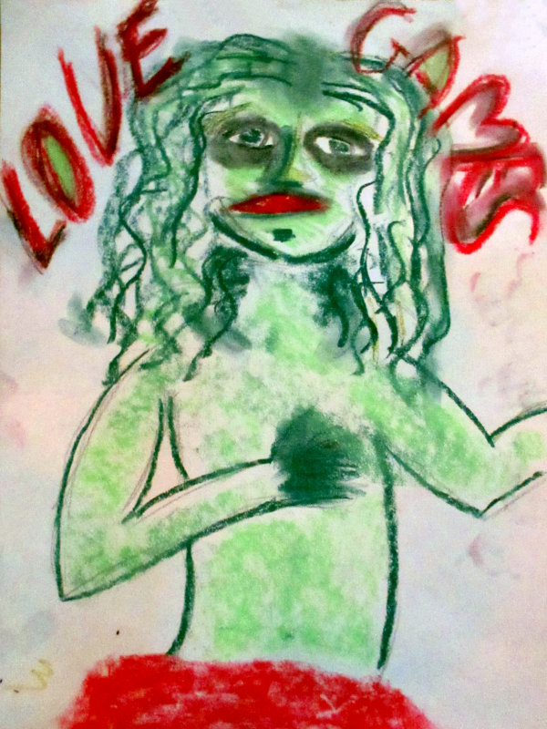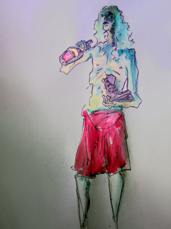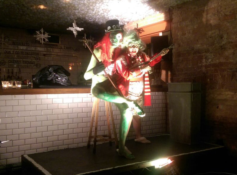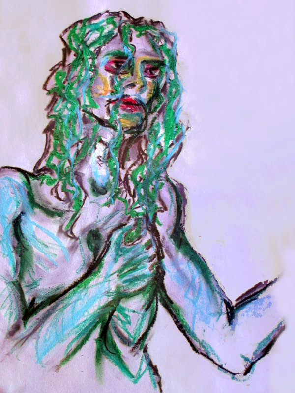 After Matilda’s two 5-minute poses it was my turn to be Old Gregg himself. In addition to green skin, I had dark eyes, dark moustache, red lips, red tutu, pearl nipples and a green plastic seaweed wig. With a bottle of Bailey’s and a shoe from which to drink it, I posed for 10-minutes, 20-minutes and – by popular demand – an extra 5-minutes. In between, Nikki wove the storyline, and played Boosh extracts while artists sketched.