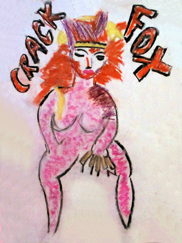 Next on stage was Raquel as The Crack Fox – furry-faced, faux fur stole and syringes for fingers, but otherwise fully nude. Whilst this exotic facsimile of the Julian Barratt original entranced our artists for 20-minutes, Nikki set about adjusting my greenery in the back room. Off came the seaweed, off came the tutu, and off came the gratuitous pearl nipples as I was transformed into another Noel Fielding creation.