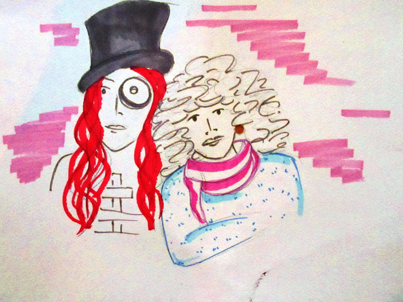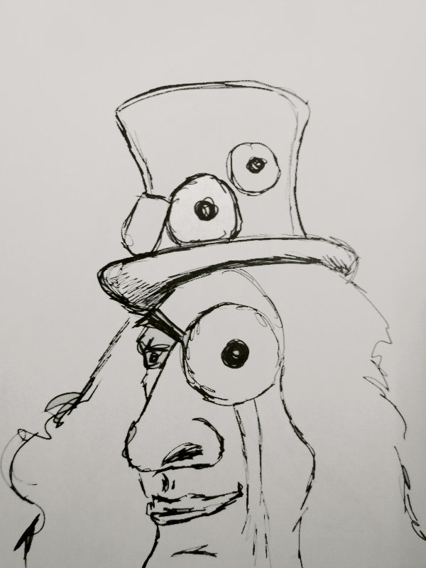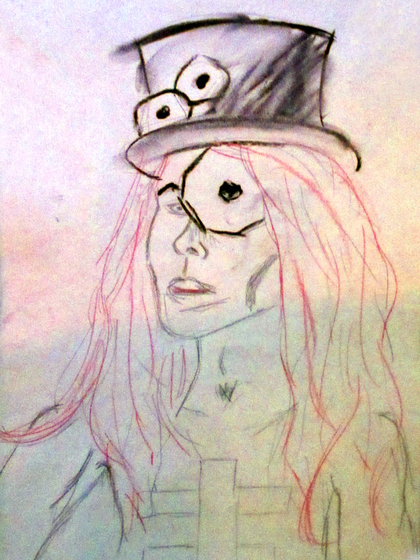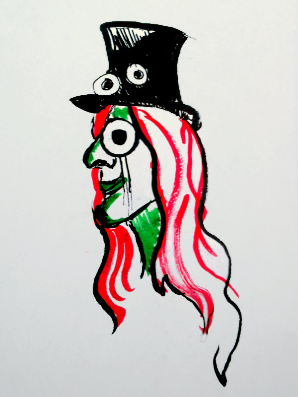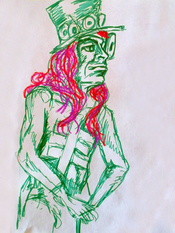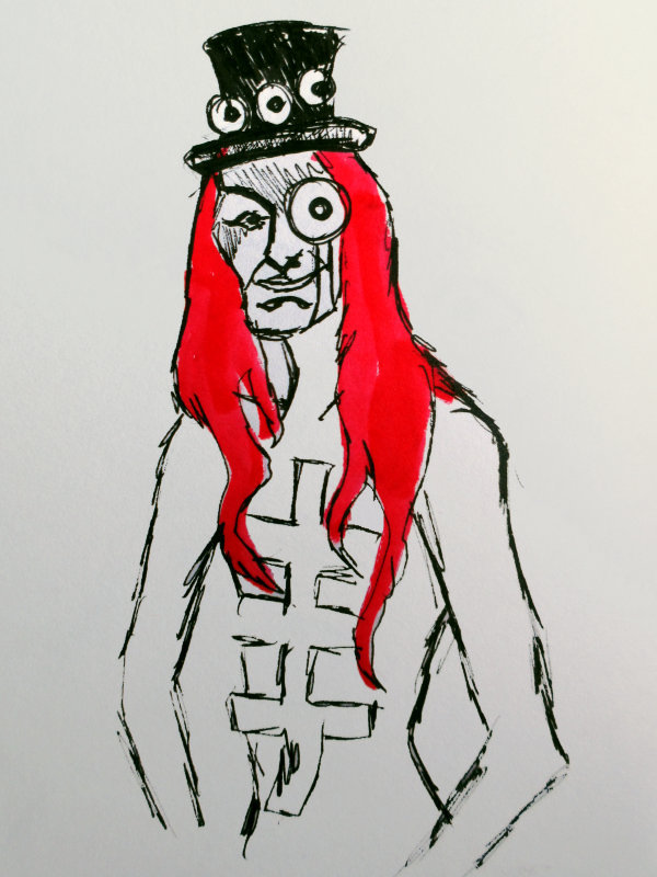 The combined body warmth of more than forty busy artists could not quite permeate to where I waited, so I hugged a coat tightly around my shoulders as Raquel’s pose came to an end. At the appointed moment I emerged once more, resplendent in red wig, top hat, a white sticky-tape triple cross on my chest and a giant Polo-mint over one eye. I was… The Hitcher! My friend Louise loaned a cane to perfect the look.