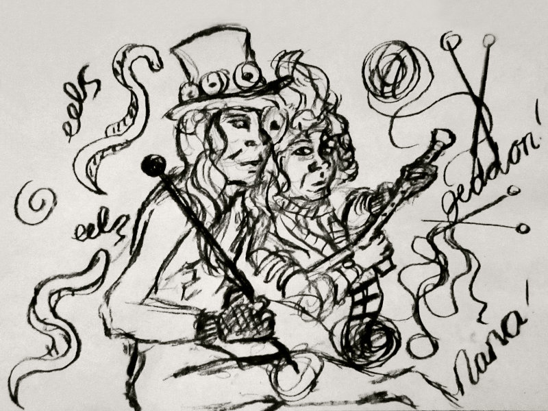 Nikki asked me to pose in a proper bandy-legged Cockney style to start, so I obliged for 5-minutes. Next I perched on a stool for 15-minutes, a tad more relaxed until Nikki burst forth as the evil screeching Nanatoo – a very noisy granny – to pose with me for another 15-minutes. But the poor old dear only lasted halfway till her back packed up and she needed a stool of her own. A final 5-minutes standing, and I was done.