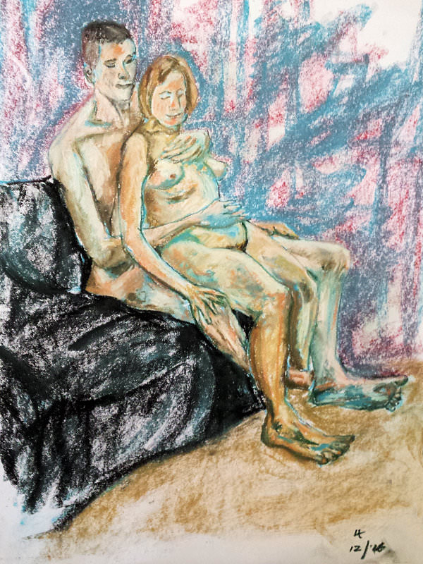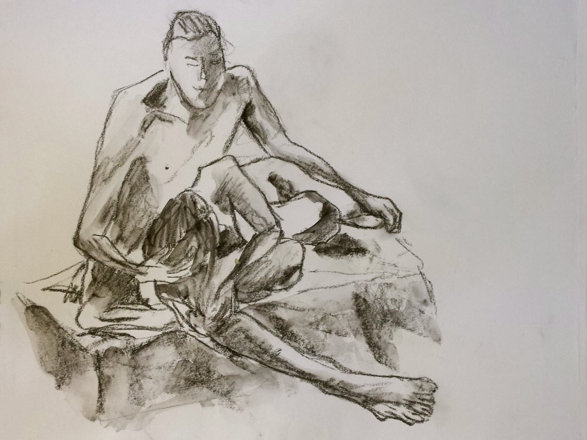 It could also be a challenge for models. At 3-hours, this would be the longest session in which Esther and I had worked together. An hour of short poses was to be followed by a single pose of 90-minutes. Our ability to sustain balance and intimate closeness without aches and numbness would be tested. The opening three poses of 5-minutes were a good start as first we stood entwined and then varied our relative heights.