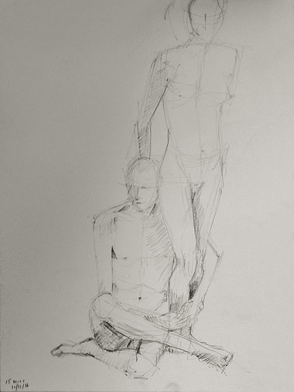“Our last session for 2016 is on Saturday 10th December and I have a special treat in store for you (and I don’t just mean mince pies!)” This enigmatic teaser was posted on the Facebook event page of Croydon Life Drawing Group by its organiser, Francis Wardale. His treat? For the first time in their nigh thirty-year history, the group was to face the challenge of two nudes in duo poses. Specifically, me and Esther.