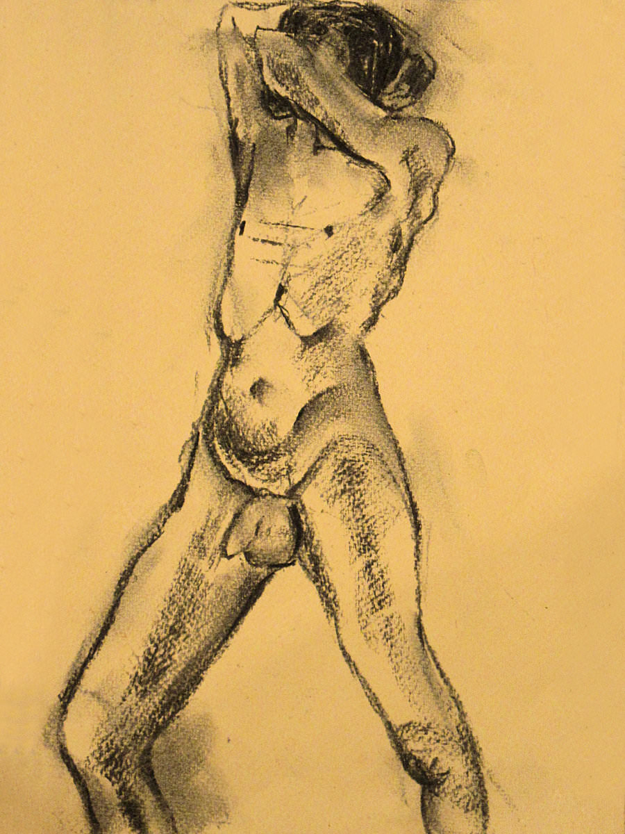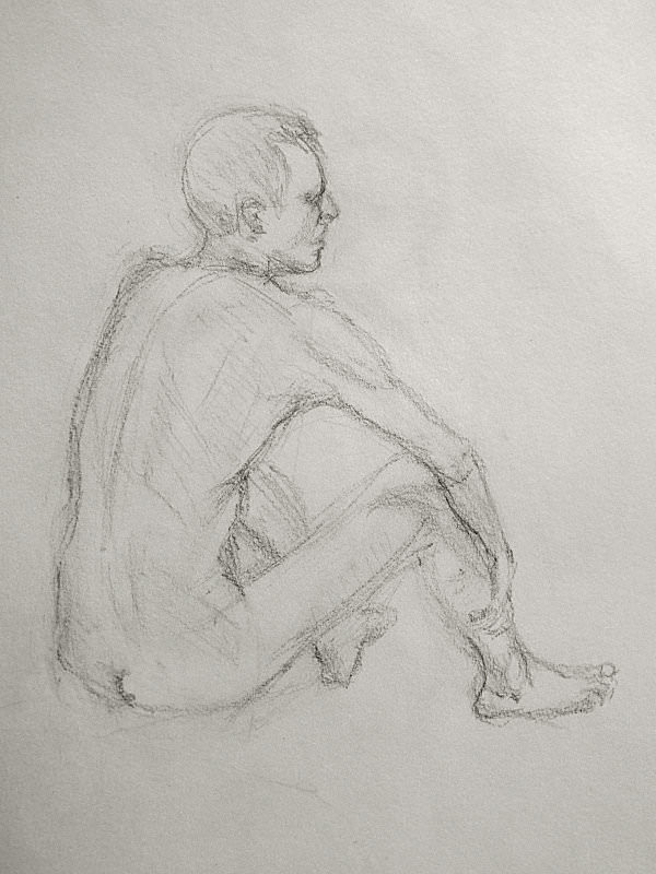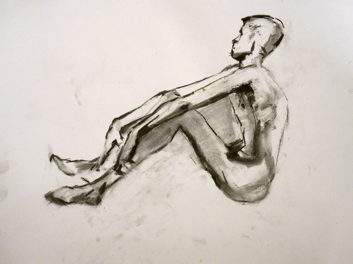 Next I fulfilled a request. One artist had descended upon me when I arrived and asked if I would provide a specific pose for her. “I want you sit to like this,” – she said, sitting on the floor, legs wide apart, hands on knees – “with everything showing.” Not quite to all tastes, I thought, but agreed anyway. Cometh the time, I was able to angle myself so only the requester got her desired full-frontal whilst others had nice side shapes.
