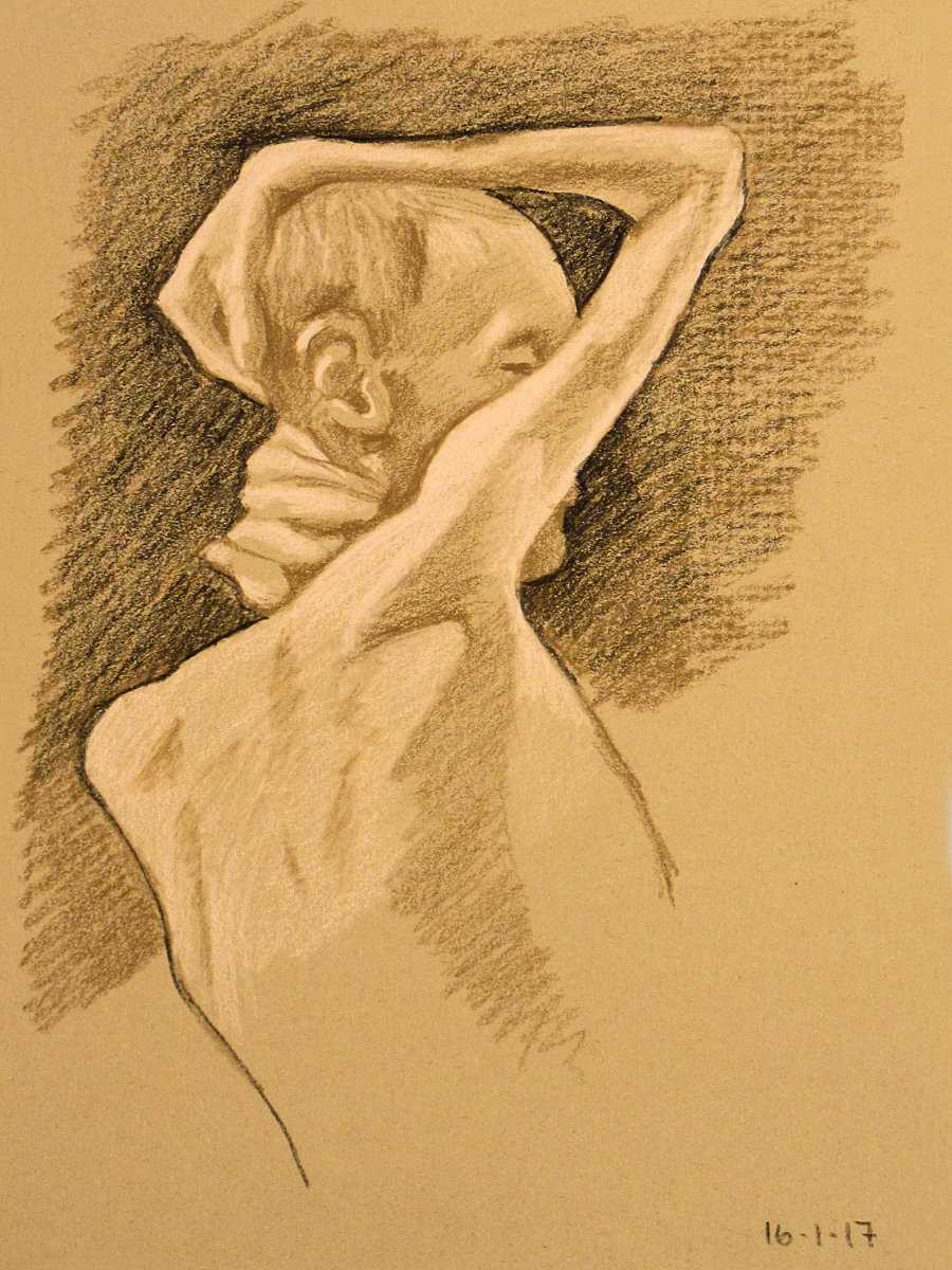 Working in the round, four poses, two either side of a tea break; I usually open with a standing pose, rotate for a sitting pose, then sit and recline in no particular order after the interval. To start, I tried a variation on my long pose at Morley College last week. In particular I wanted to test my theory that if I spent more time stretching beforehand then I wouldn’t feel as much discomfort. And, of course, it was true. Note to self…