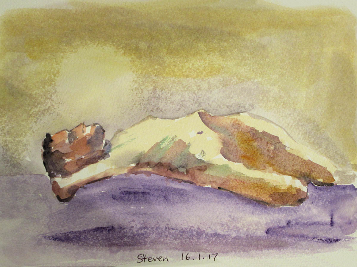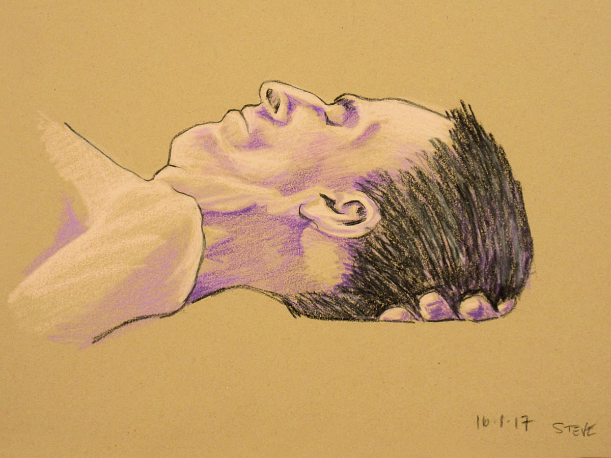 I resumed the second half with another seated pose, albeit this time somewhat more decorous. Facing in the opposite direction, I perched myself side-saddle on the edge of the posing bench with one arm placed in front of me and the other set behind. This was followed by a supremely comfortable twisted lay-down to end the session. It had gone well – I felt no aches or pains, and the artists shared their work enthusiastically.