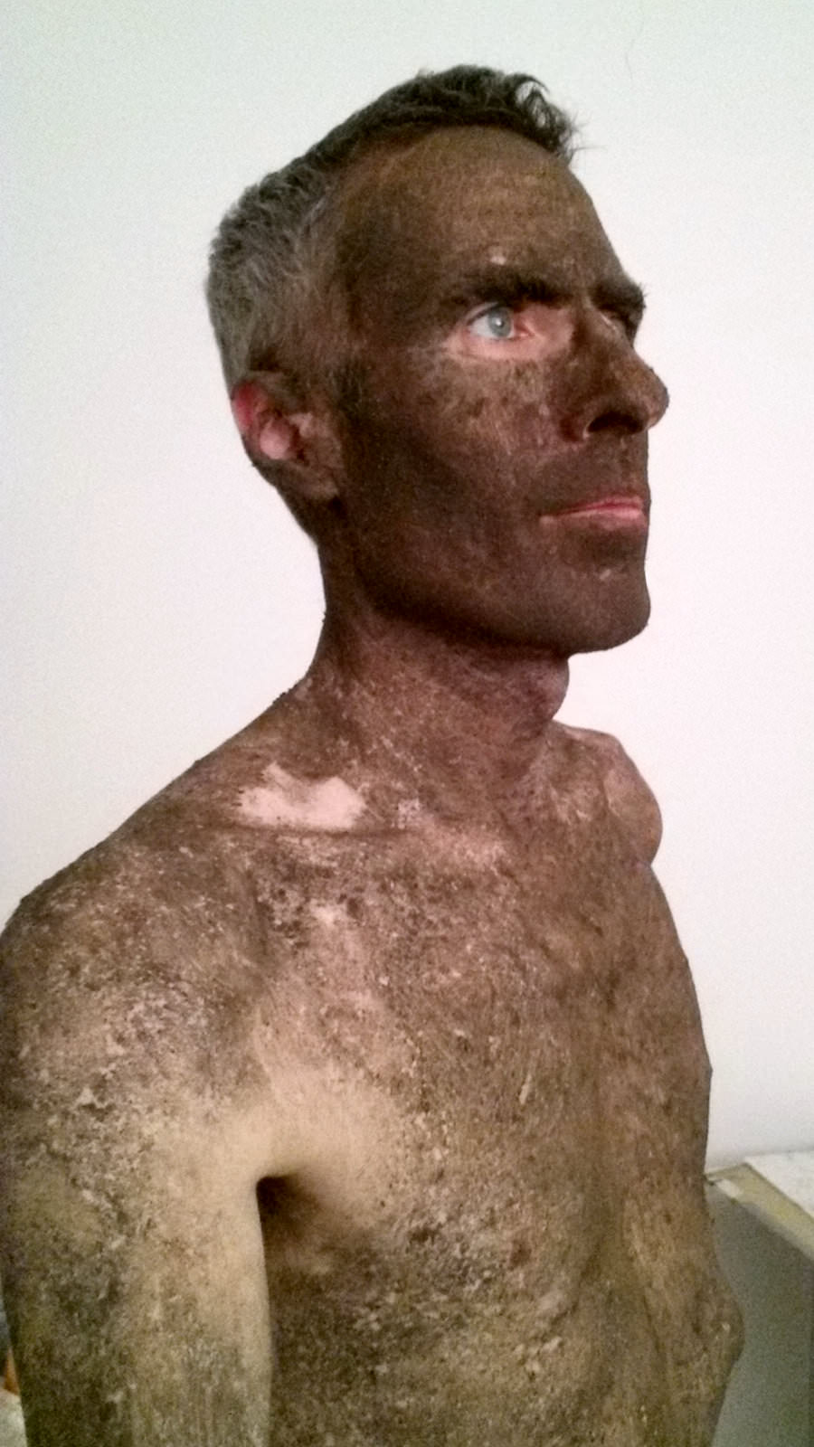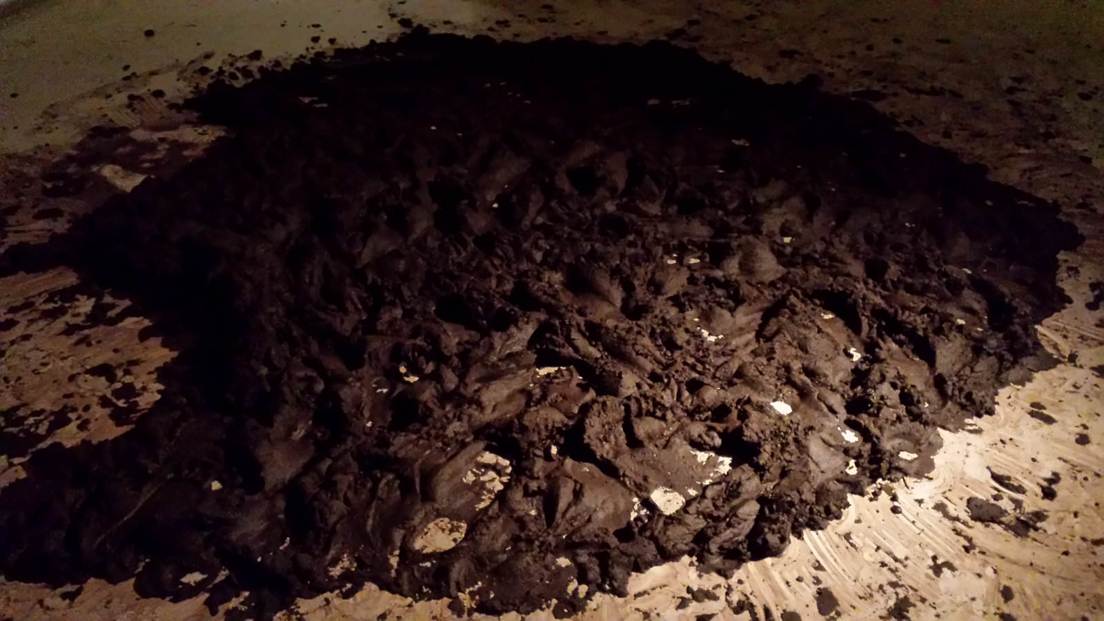 We were due to begin the performance at 6:30pm, but first there was to be a talk by Jo Melvin, the exhibition’s curator, in the gallery downstairs. The challenge for us was to stay silent as we applied handfuls of filth to our own bodies, and the hard-to-reach places of our friends. Once completely covered, without further ado or prompting, we started automatically to trample around in the muddy mass.