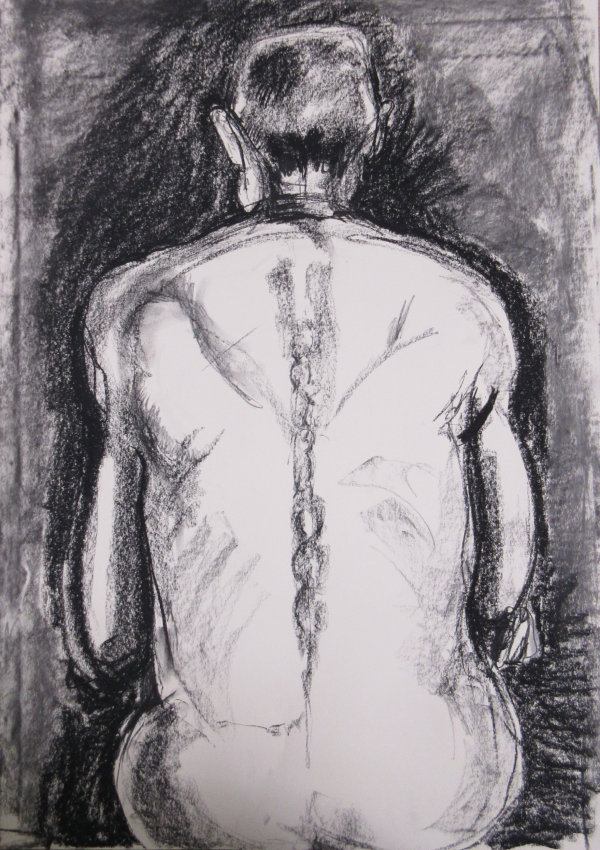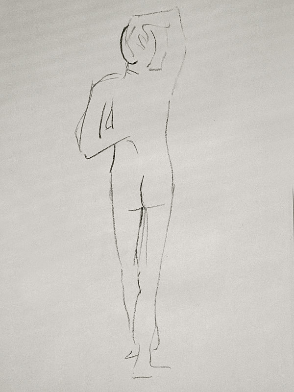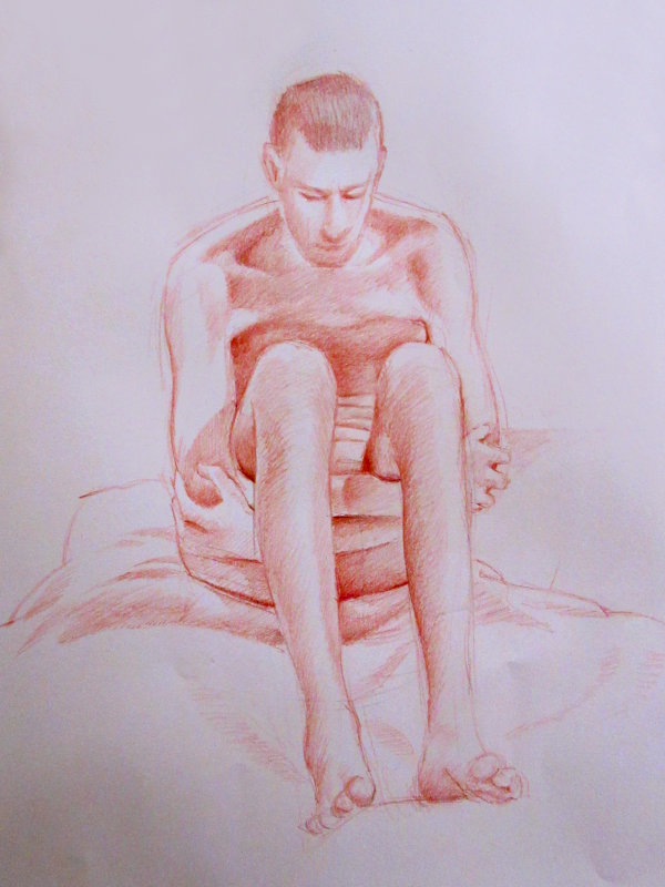 Tutor Victoria Rance had suggested various options for the long pose but we agreed this would work best tonight; we will pick one of the others when I return in five weeks. Nine artists had arranged themselves in a circle round me, while Victoria also painted sketches in a drawing book when not offering comments and advice. By agreement, I was given time checks every 20 minutes with the chance to have a stretch.