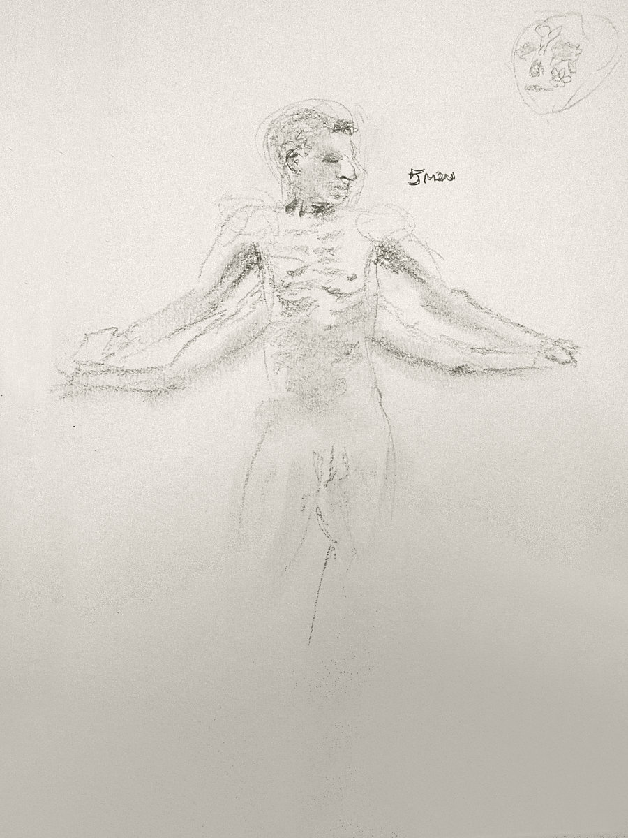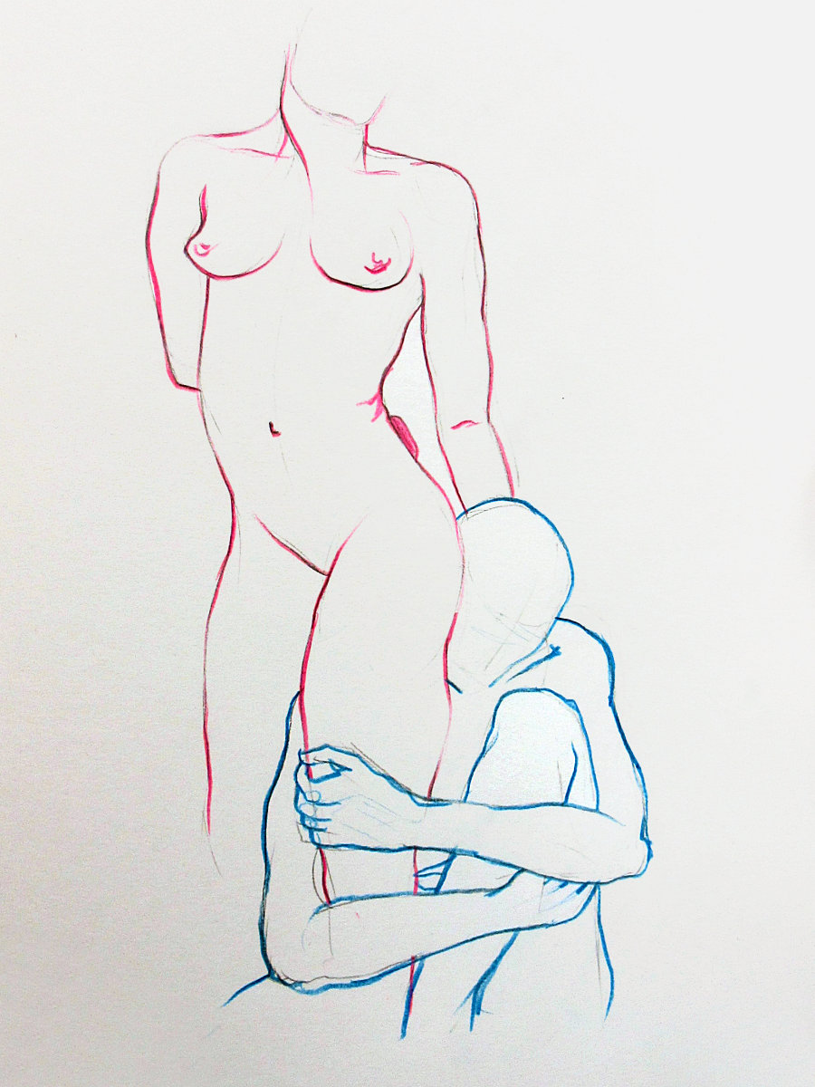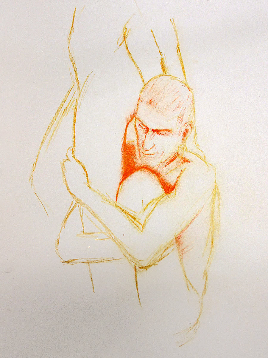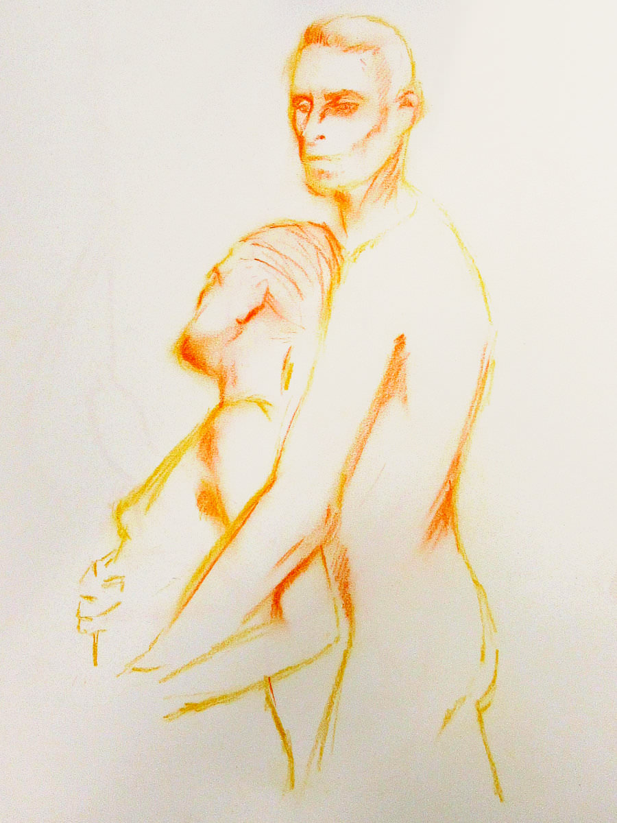 Esther and I arrived quarter of an hour early at Fairkytes Art Centre, yet found seven artists were already sitting in a tight arc around our pose space. More turned up while we chatted with group organisers Natansky and Estelle. In our first pose – 5-minutes standing back to back – I faced away from the door and couldn’t see what was going on, but still it sounded like every few seconds another person was walking in…