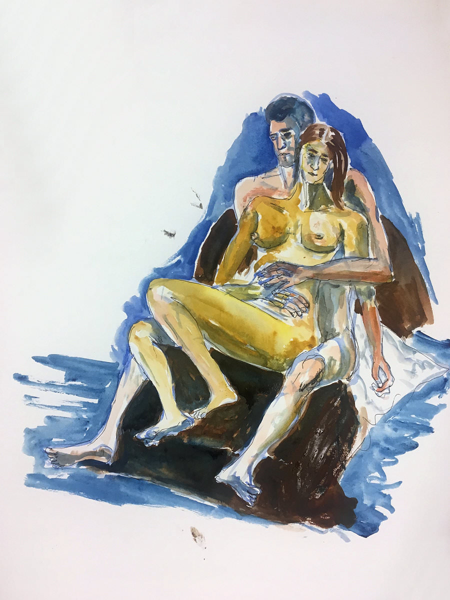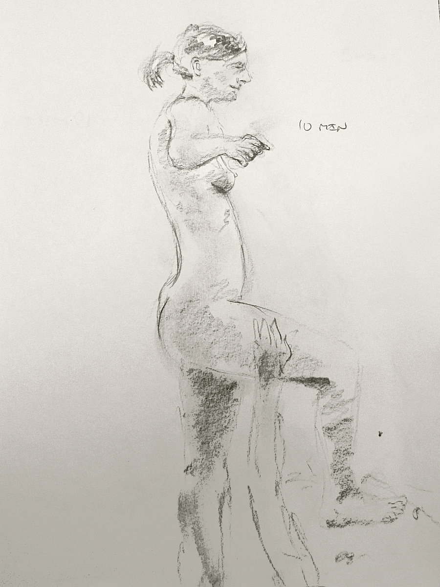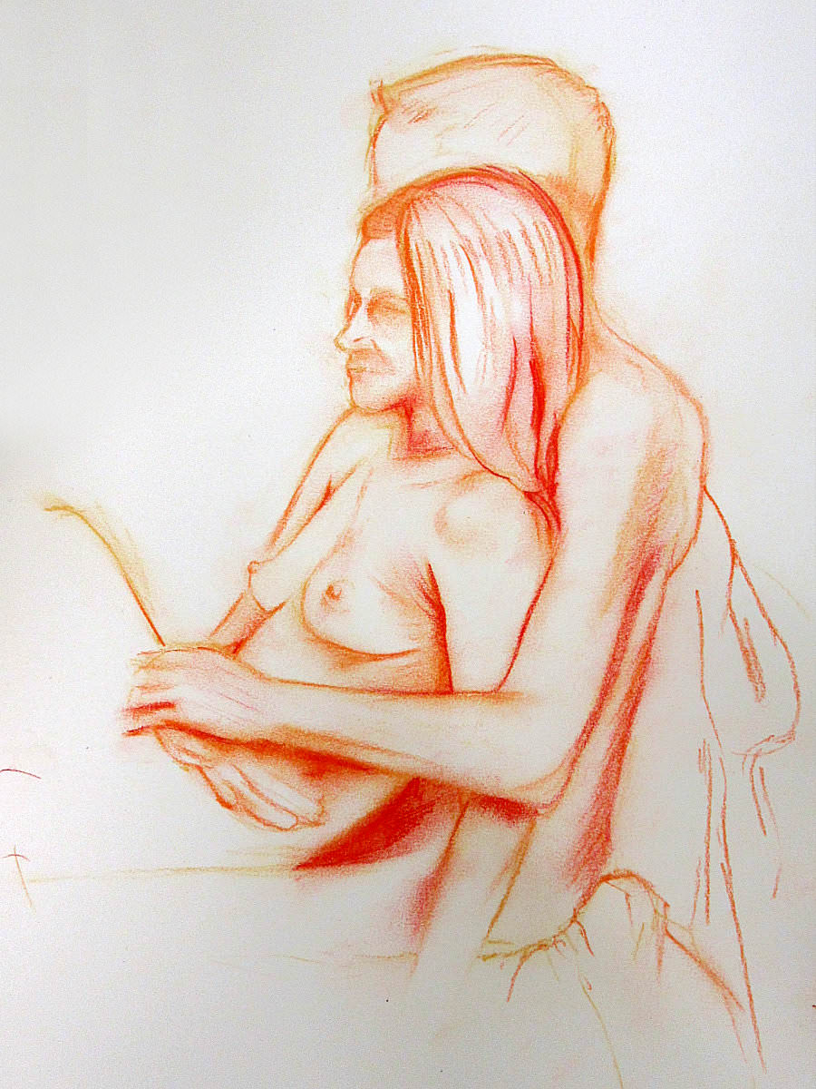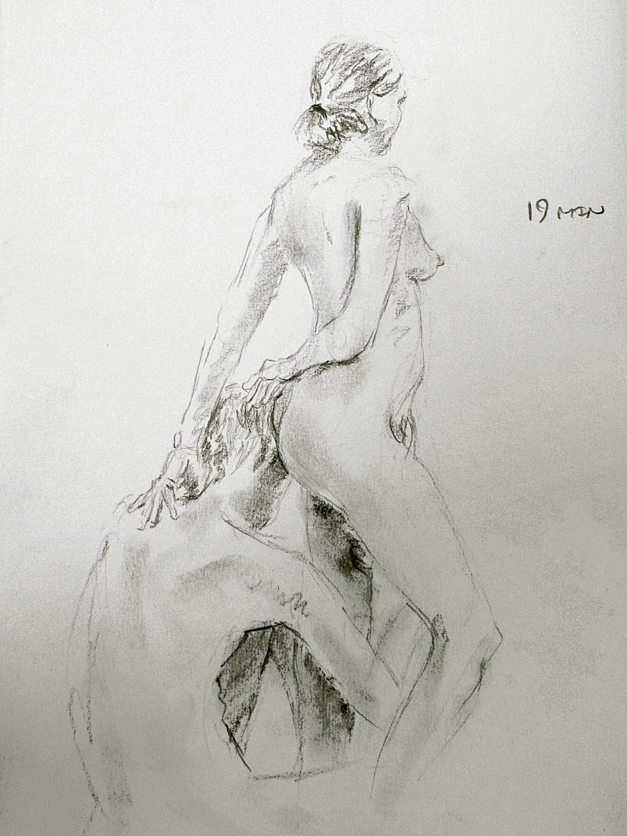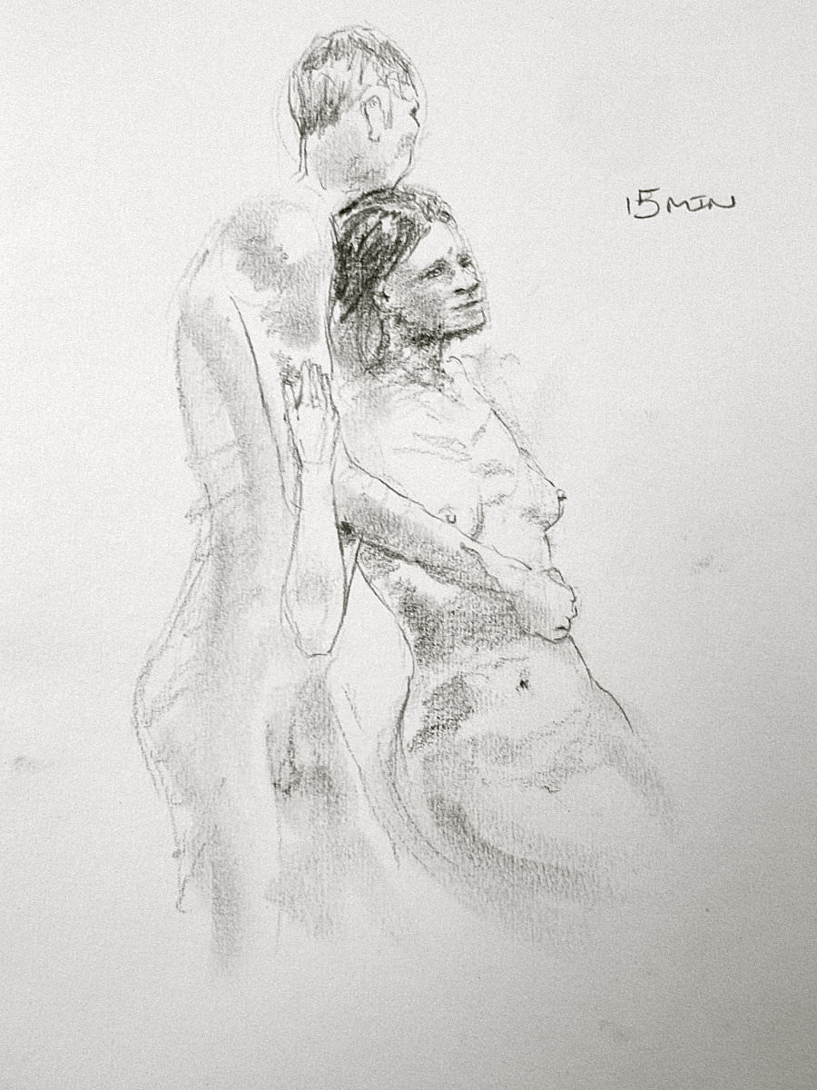 Eventually we had an unprecedented eighteen artists drawing us, some finding space on the floor when chairs ran out. For our second pose, I reclined for 10-minutes whilst Esther stood with one foot upon my chest. Next Esther sat on a bar stool and I stood behind her for 15-minutes; finally with 19-minutes left in the first half, Esther stood tall as I sat hugging her left leg.