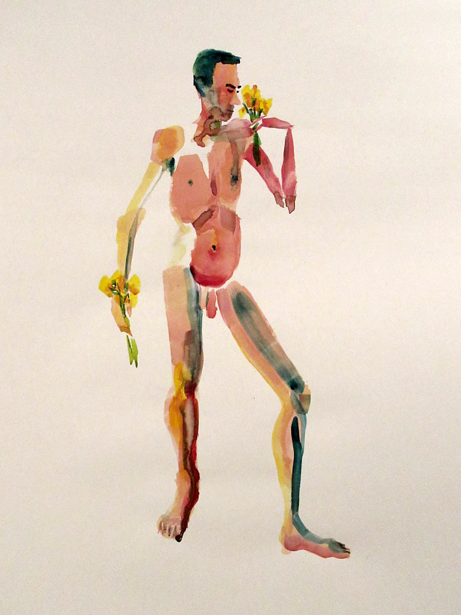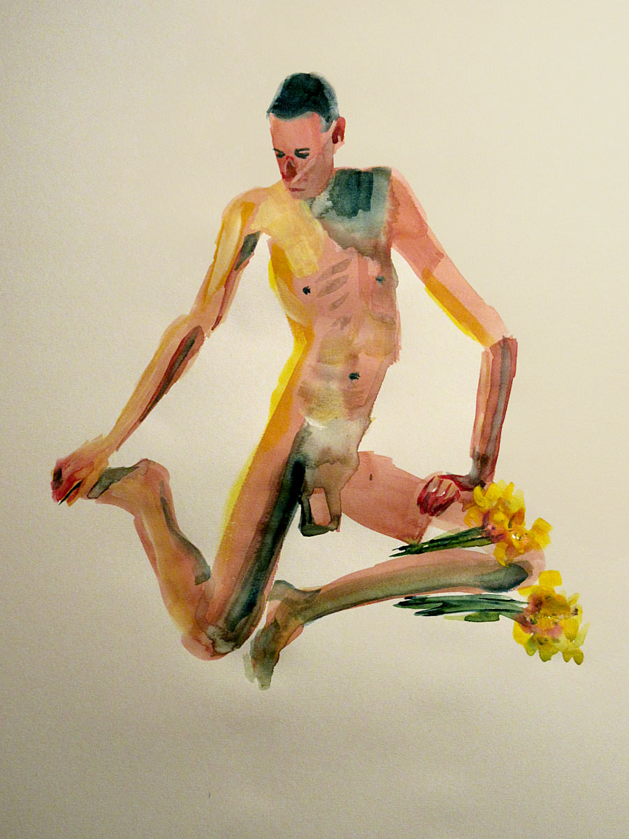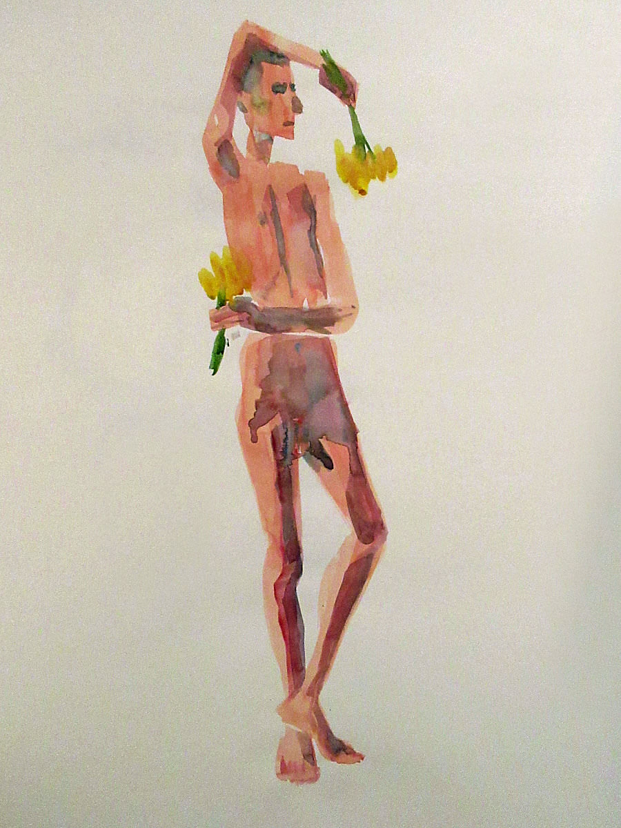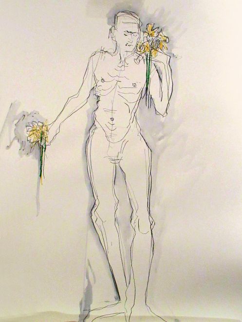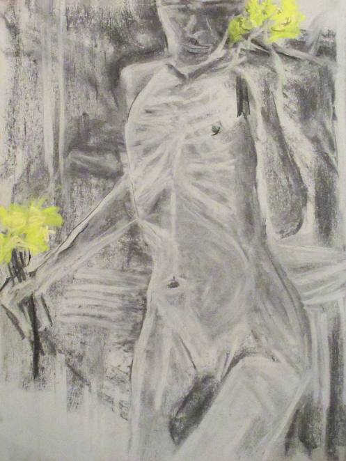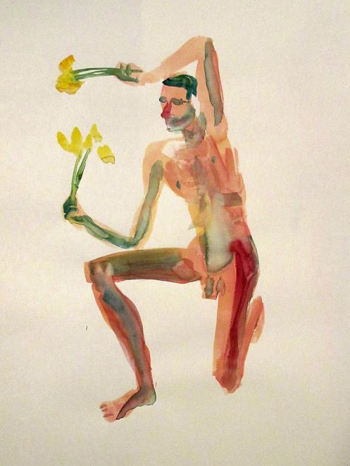 Vanessa was to start modelling in the main room – entwined in the legs of a table on its side – whilst I would take the floor in an adjacent room. As is the standard format, we would then swap rooms at half-time. Lisa armed me with two bunches of the daffs and asked me to be expressive with my limbs through a sequence of short to medium pose lengths. I began with 10-minutes standing, one arm crooked over my head, and the other crooked across my belly.