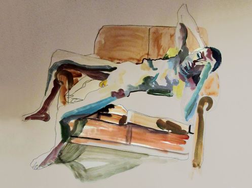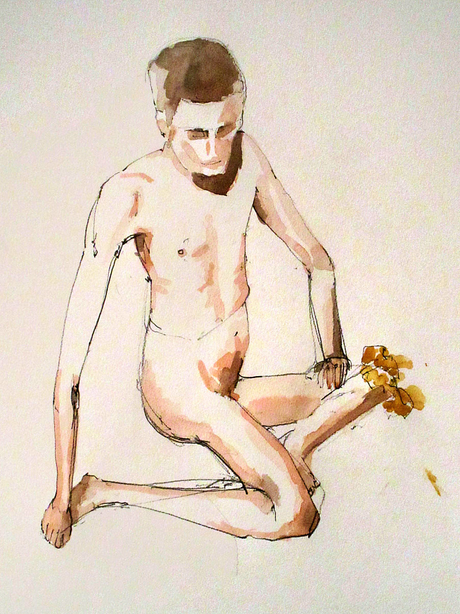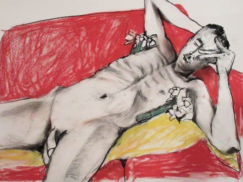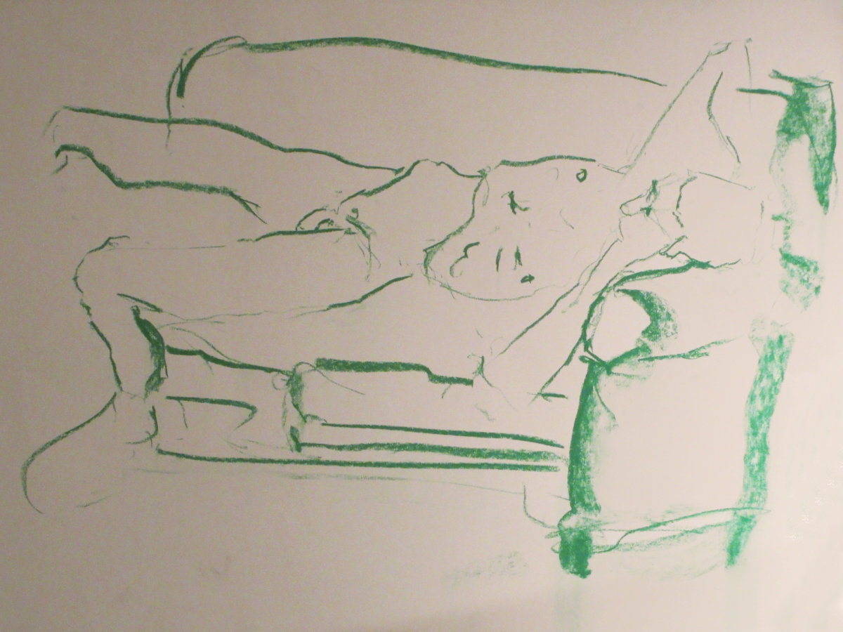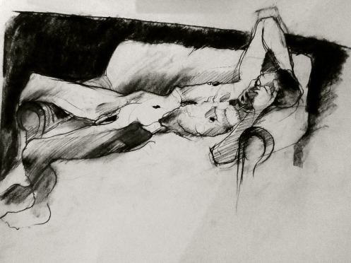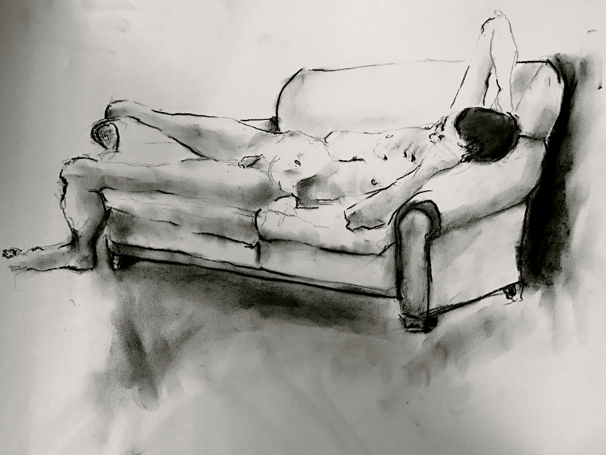 During the interval I switched to the main room where a single 40-minute pose would bring our session to an end. Lisa asked that I lay upon a sofa – fine by me! At first, I hitched up my knees so I was partly-curled, but instead she asked that I sprawl out, with one foot down on the floor. I duly complied and, with daffodils under each armpit, concluded the session in relative comfort. As ever, a plethora of artists at easels had worked wonders. This remains one of my top 5 favourite venues to model.