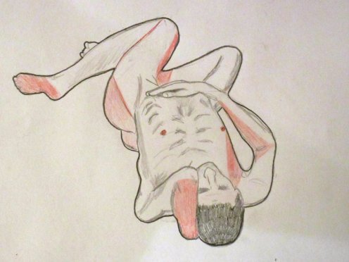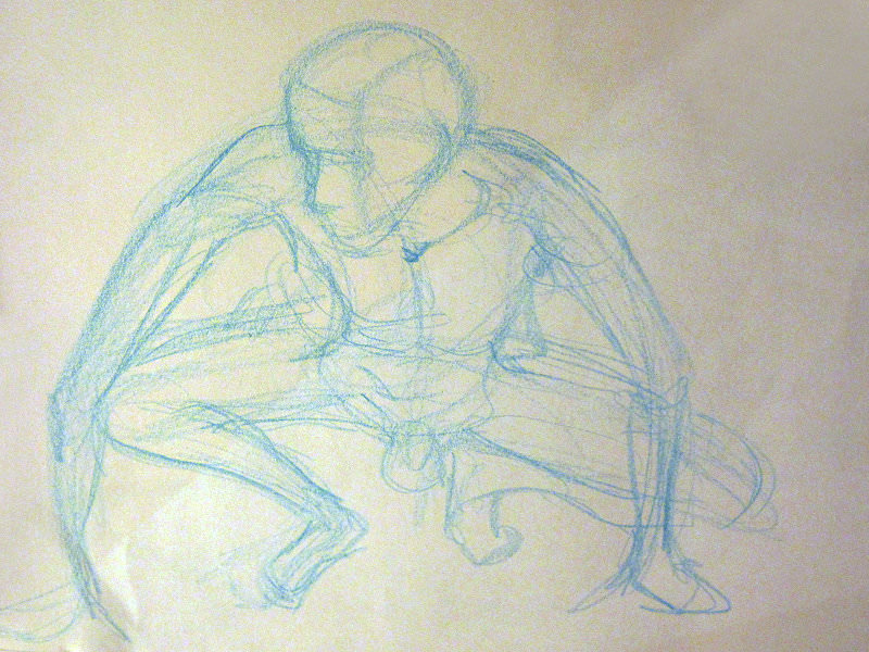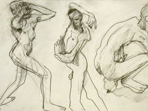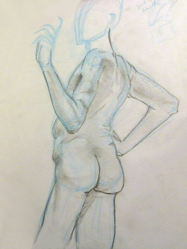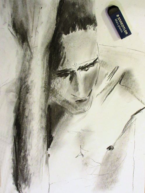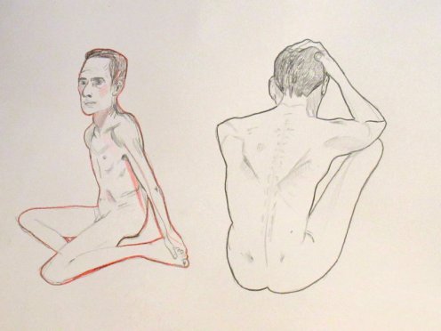 The ingredients for an excellent evening’s life art were all there so it was little wonder the small ground floor space was packed on all sides by artists. I barely had room to drop my robe and begin. Even the ceiling was close – for the first pose I held onto an overhead beam with one hand and reached back to grab a raised leg with the other. I bumped my head on the lights too, and found the atmosphere in the room hot and at times almost stifling, but truly I loved the intensity, enthusiasm and the playlist.