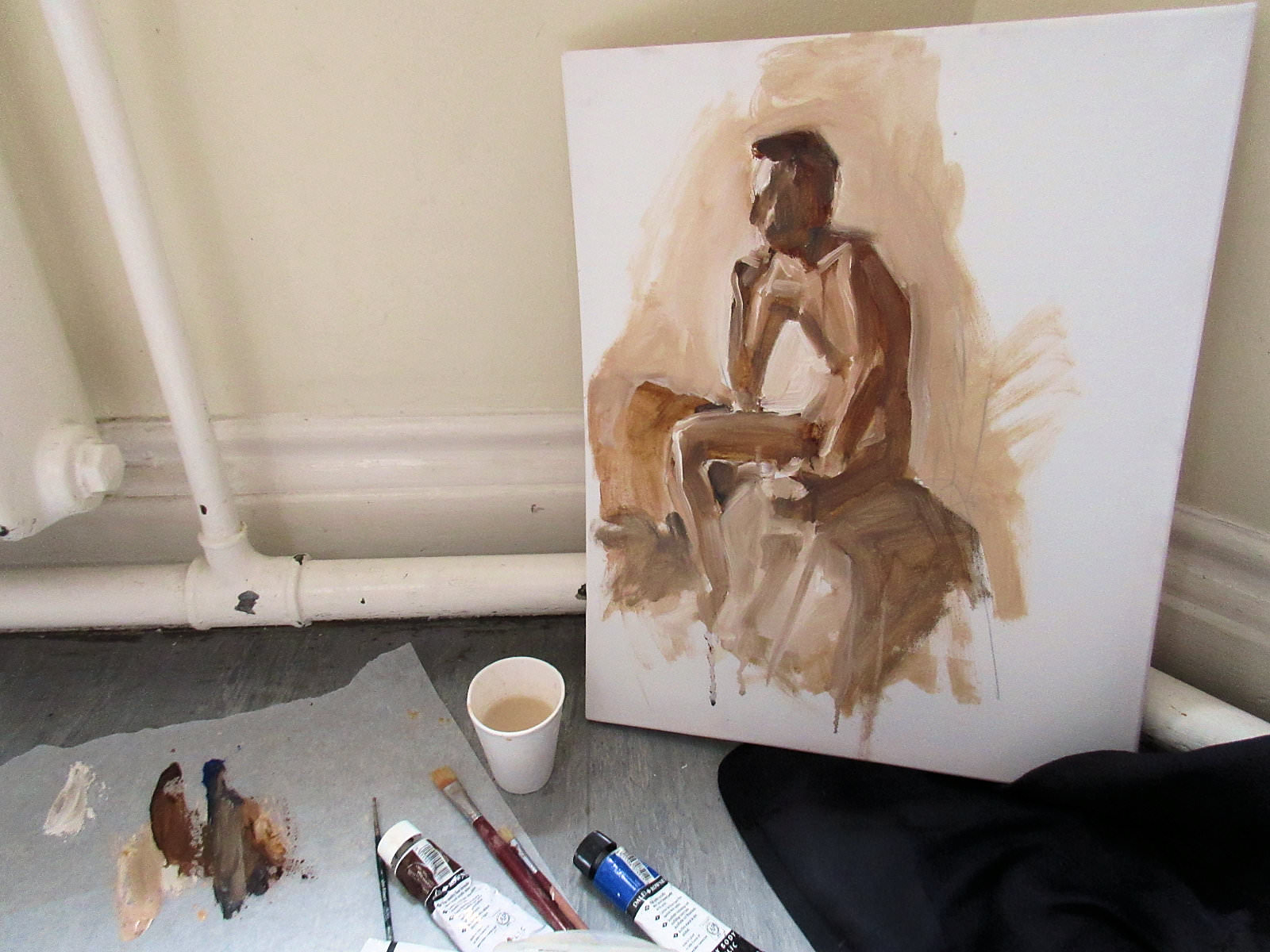 As sometimes happens, I found the lower floor at Wanstead House fully occupied by worshippers of Grace Church. This was a tad awkward for me when I arrived, as they had congregated in the room through which the gents’ toilets are accessed. I deferred answering the call of nature and instead helped life drawing class organiser, Patrick to take the tea-making things upstairs to the Roding Room, where poses would begin at 10:30am.
