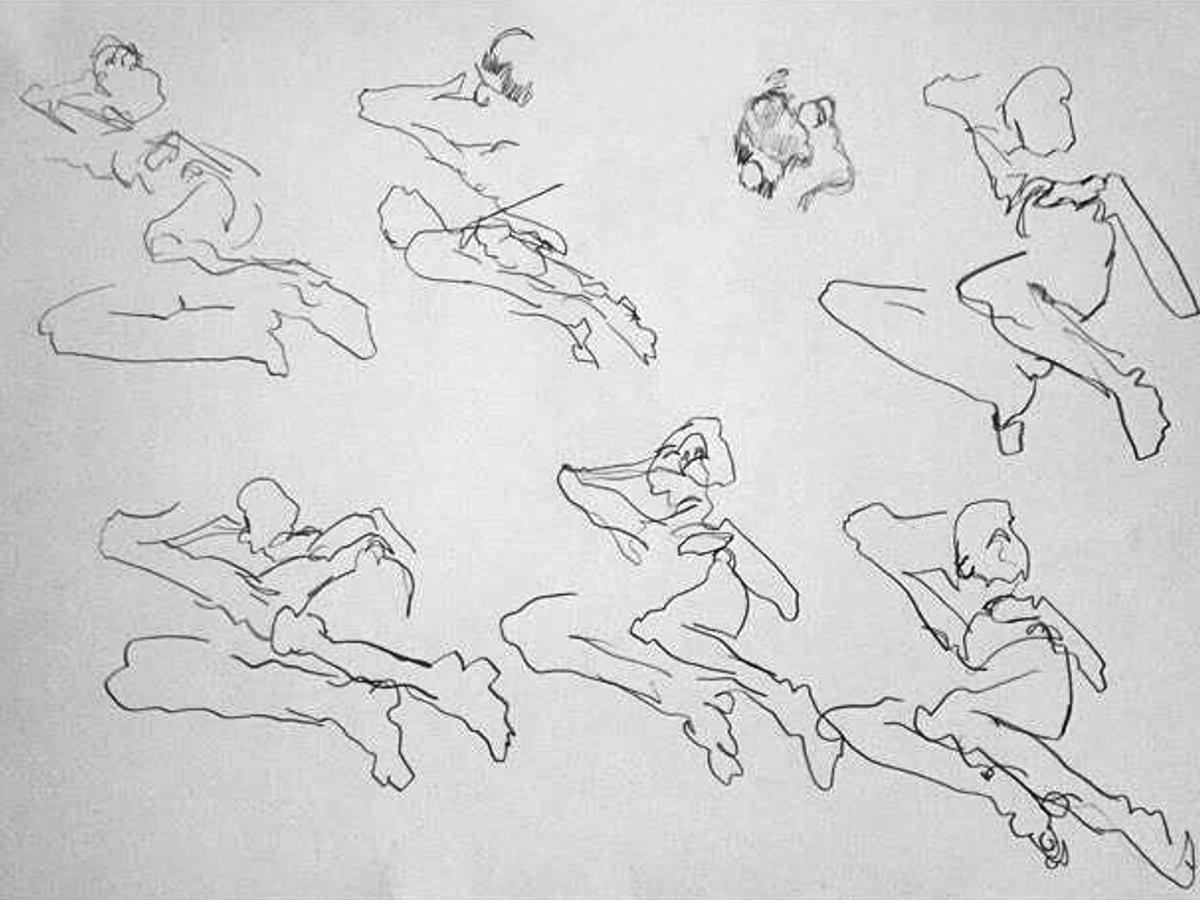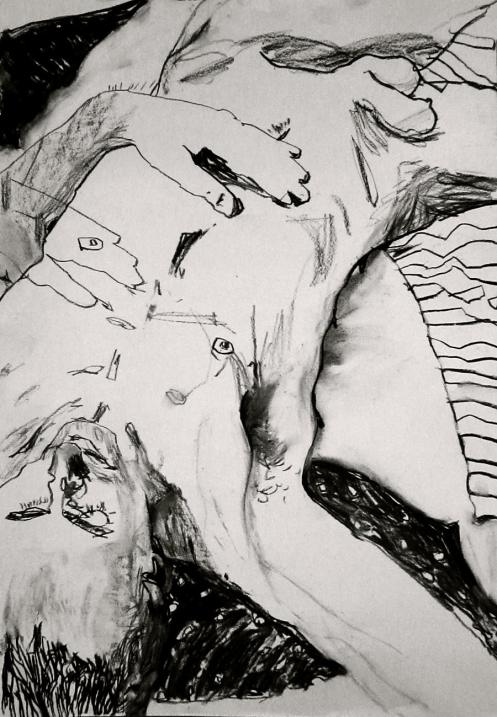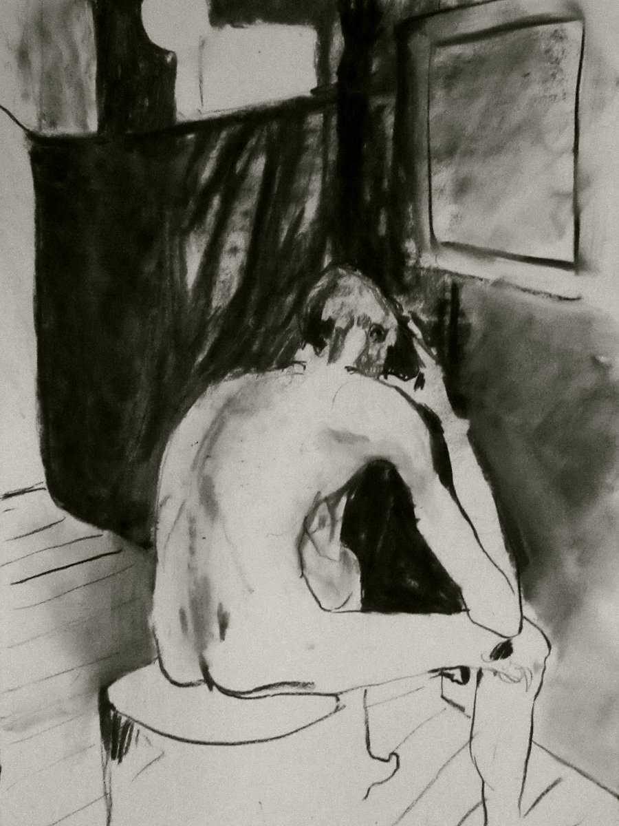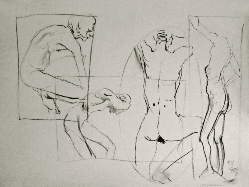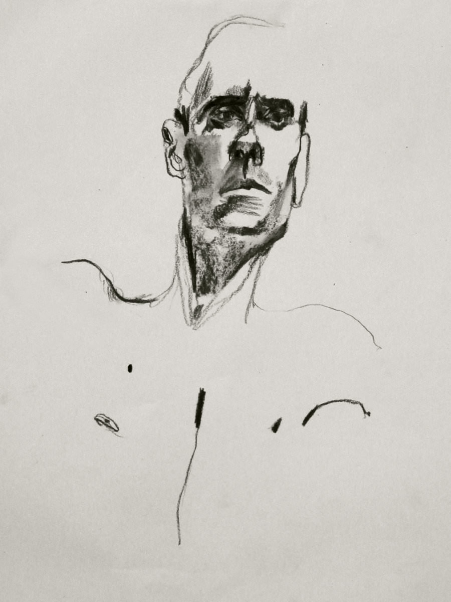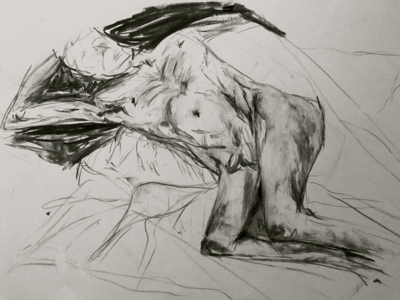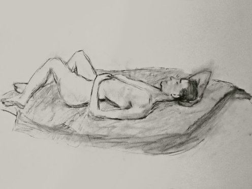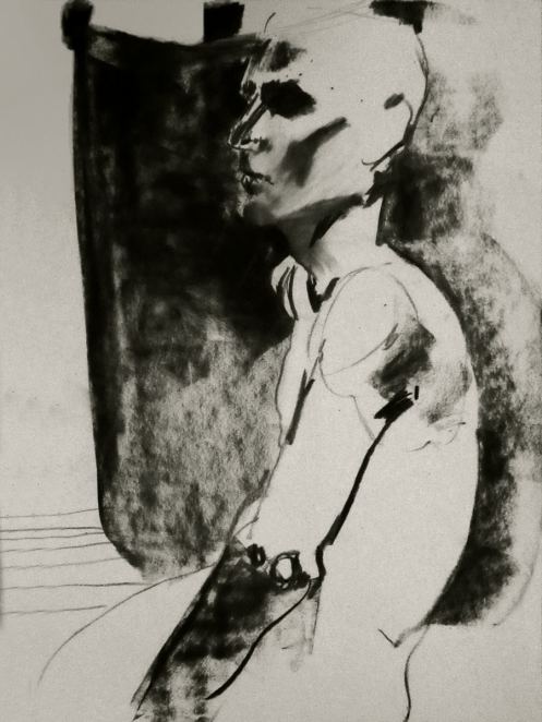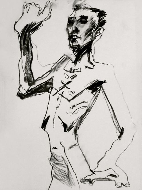 Two years had passed since I last visited The Telegraph at The Earl of Derby. On that occasion – before Esther and I were together – I was merely part of the audience for a sell-out performance her Girl in Suitcase play; even so, I managed to contribute a little life modelling of my own. Now in 2017, the same upstairs room is the venue for weekly life classes hosted by London Drawing Group and I was here to model solo. We started with four 1-minute poses and four 2-minute poses.