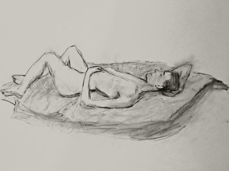 After these early challenges, artists had more of a free hand to draw as they pleased, and I alone received direction. This was simply in the form of requests for standing or seated poses, but otherwise I was at liberty to select a stance. As pose lengths rose to 5 and 10-minutes, I switched direction and posture on a low bar stool, and finished the opening half in a standing attitude with one arm raised. After the break I was able to lay down for 45-minutes, mimicking the pose from a work by Lucian Freud.