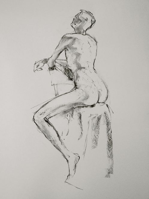 Having modelled on the final day of last term for Monday evening life drawing class at The Conservatoire, I wasn’t expecting to be back for the first session of their new term. Another model’s late cancellation meant I got the offer, however. As soon as the ten artists had prepared at their easels, I began with three standing poses of 1-minute each, followed by one of 5-minutes, and a ‘reverse Christine Keeler‘ for 10-minutes.