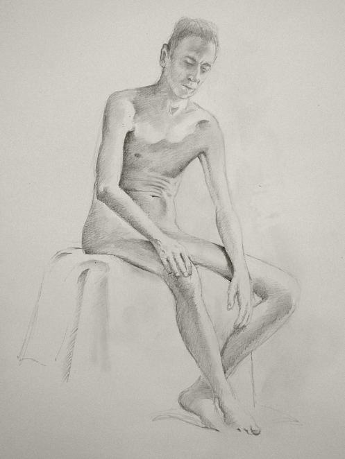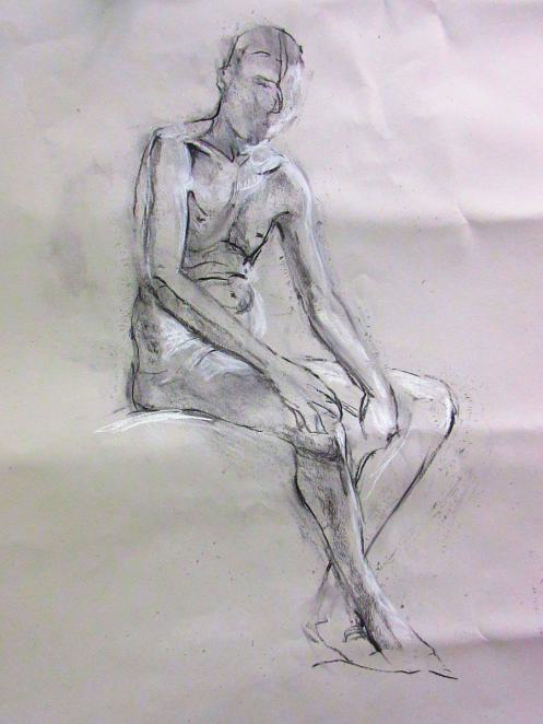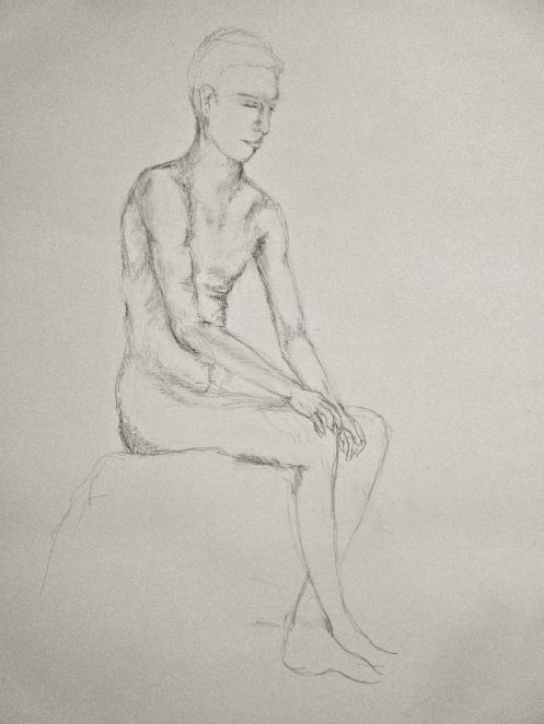 The rest of this session was given to a single seated pose, with two 5-minute breaks at 25-minute intervals. Once again the position was arranged for me: facing forwards, open-legged (thus, revealing after all), and with a curved spine of the very kind I try to avoid when working all day at a computer. It was pretty comfortable though, and two ferocious heaters did a grand job of warding off the late April chill.
