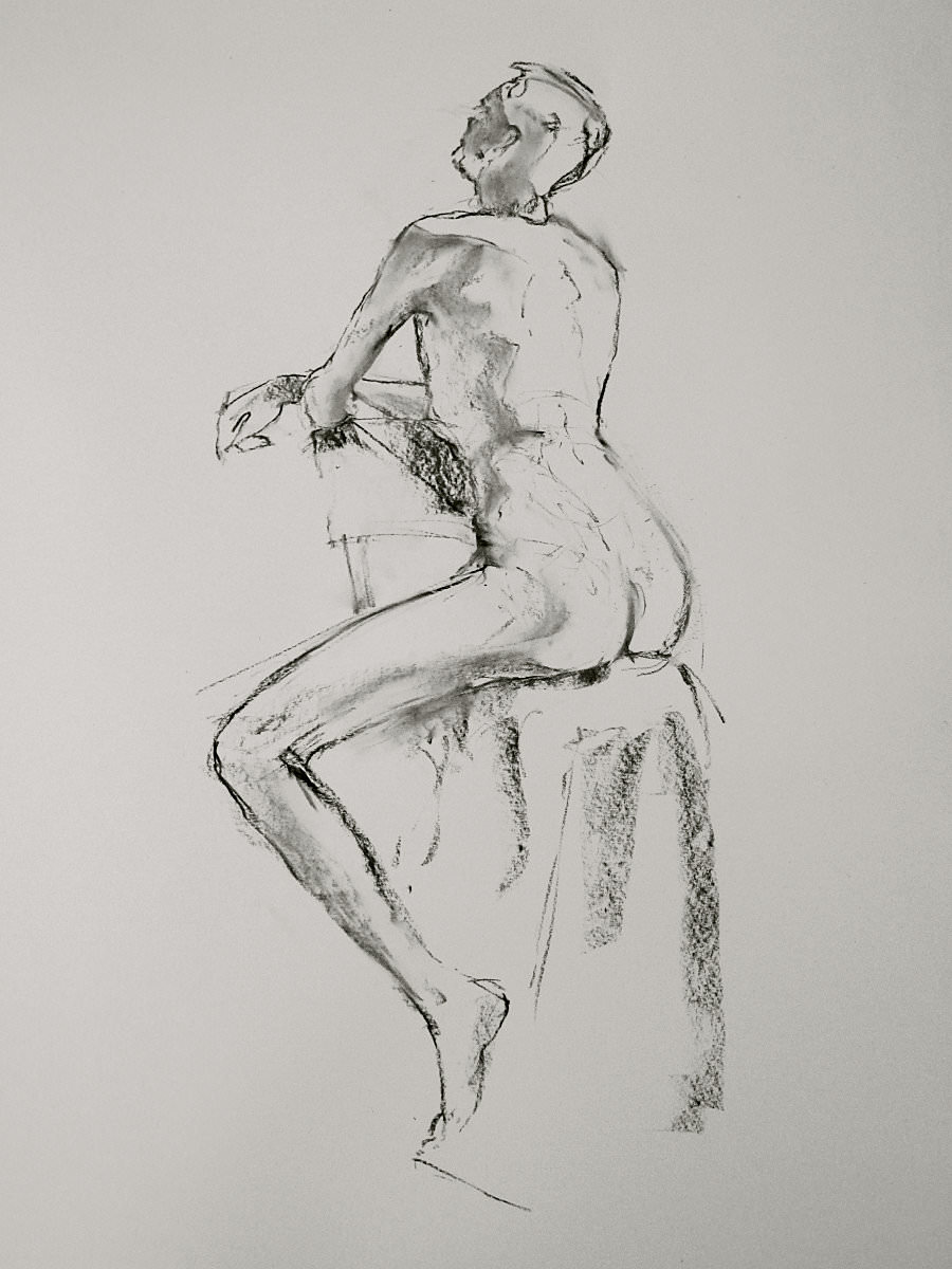 Having modelled on the final day of last term for Monday evening life drawing class at The Conservatoire, I wasn’t expecting to be back for the first session of their new term. Another model’s late cancellation meant I got the offer, however. As soon as the ten artists had prepared at their easels, I began with three standing poses of 1-minute each, followed by one of 5-minutes, and a ‘reverse Christine Keeler‘ for 10-minutes.