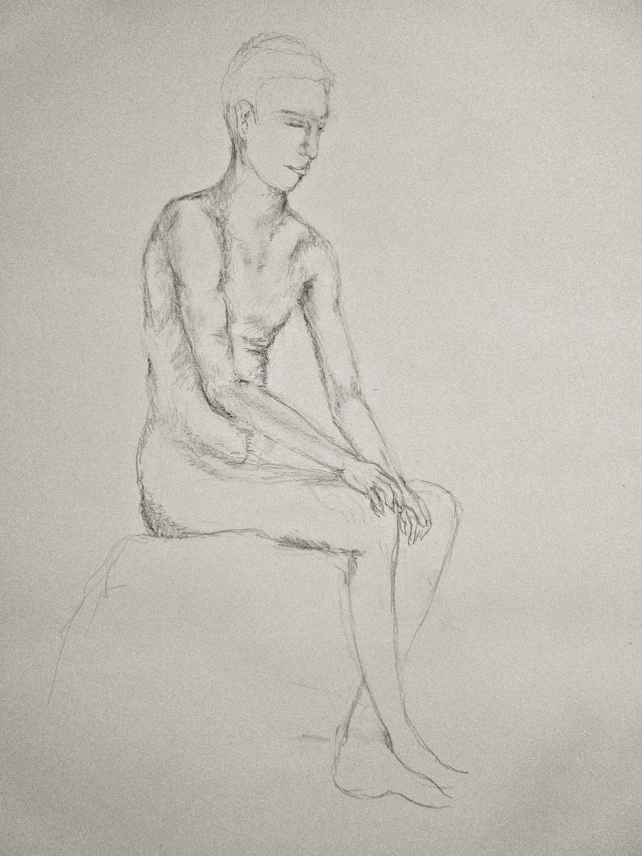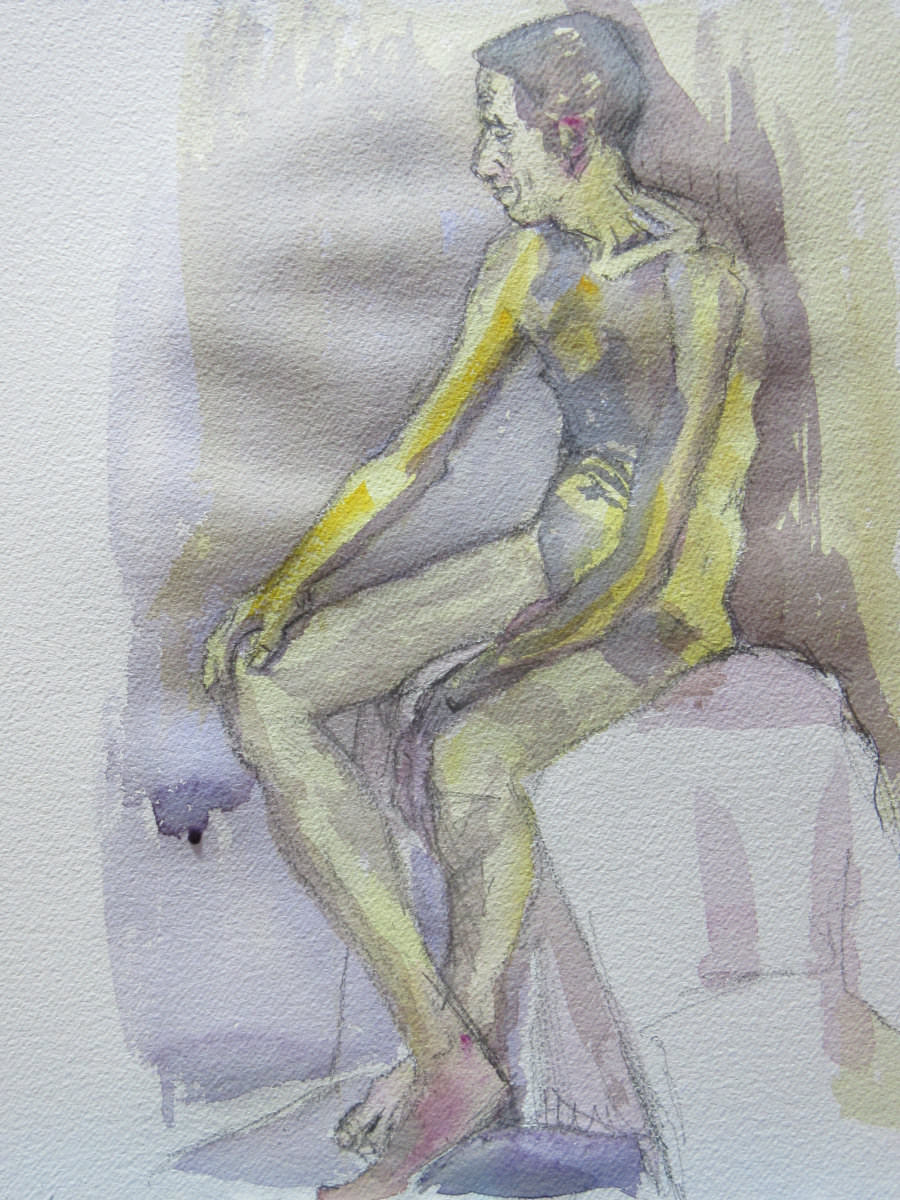 The rest of this session was given to a single seated pose, with two 5-minute breaks at 25-minute intervals. Once again the position was arranged for me: facing forwards, open-legged (thus, revealing after all), and with a curved spine of the very kind I try to avoid when working all day at a computer. It was pretty comfortable though, and two ferocious heaters did a grand job of warding off the late April chill.