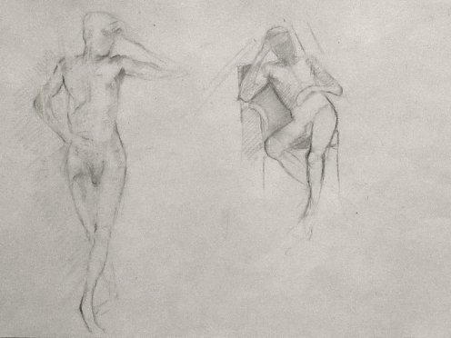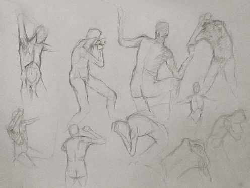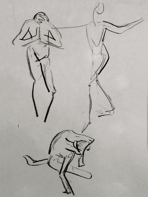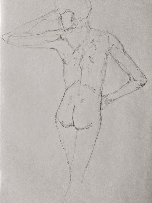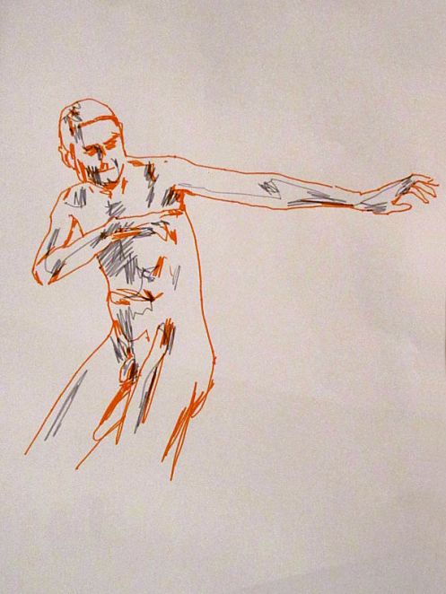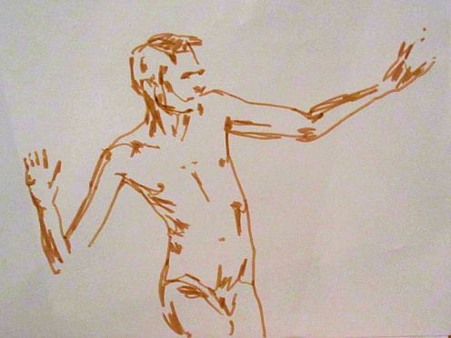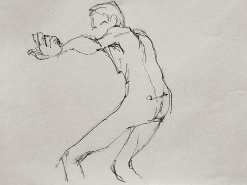 The first twenty minutes life modelling for Drawing the Star at The Star by Hackney Downs is always a good work-out. An exhausting succession of ever-shortening pose times come faster and faster: 5-minutes, 4, 3, 2-minutes, three of 1-minute, and three of 30-seconds. The quicker the work, the greater the temptation to attempt something more strenuous. Muscles begin fibrillating and may either cramp or turn to jelly during or between each pose.