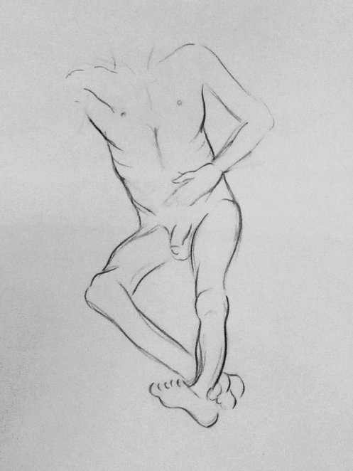Two 10-minute poses took us to a break. For the first I perched on a low stool; for the second I lay on my back with my heels resting on the seat of a high chair; that was a new one. Democracy reigned after the interval when organiser Catherine Hall invited her dozen artists to choose between one 30-minute pose, three 10-minute poses, two 15-minute poses, or a 10 and a 20. Two 15s just shaded the popular vote. I abstained, but would have gone for the 10 and 20 myself…