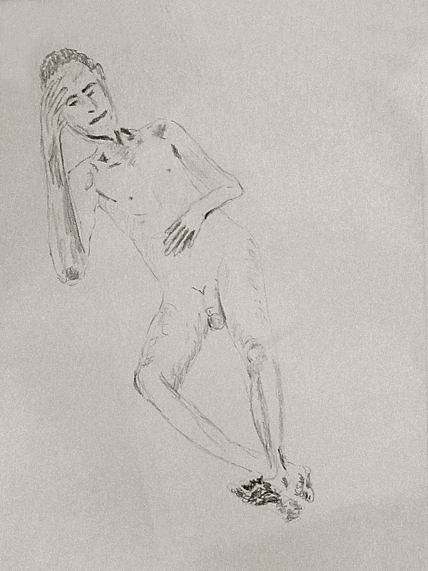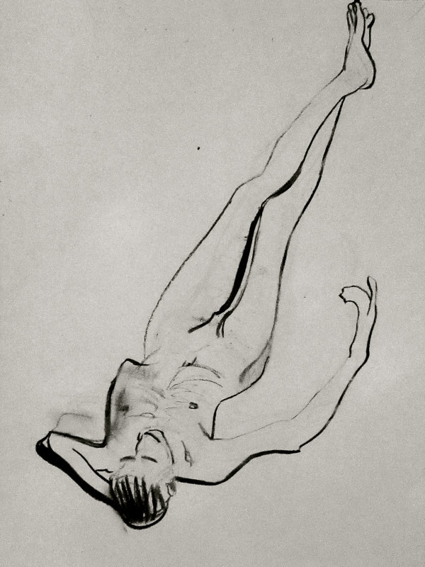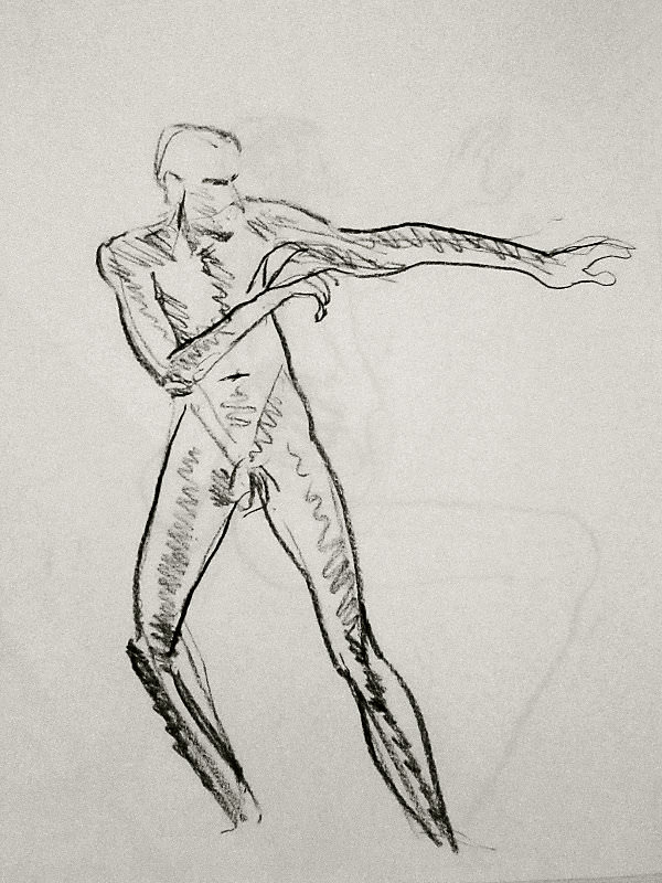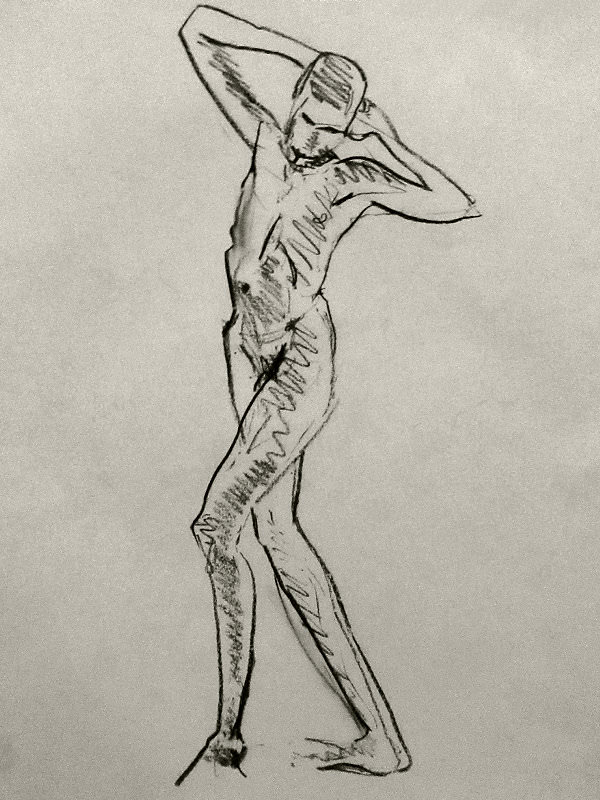 The first twenty minutes life modelling for Drawing the Star at The Star by Hackney Downs is always a good work-out. An exhausting succession of ever-shortening pose times come faster and faster: 5-minutes, 4, 3, 2-minutes, three of 1-minute, and three of 30-seconds. The quicker the work, the greater the temptation to attempt something more strenuous. Muscles begin fibrillating and may either cramp or turn to jelly during or between each pose.