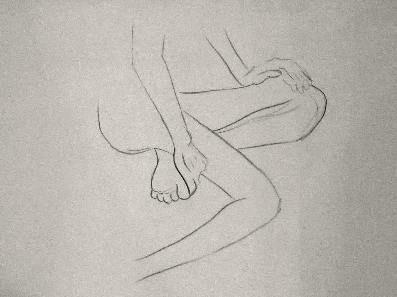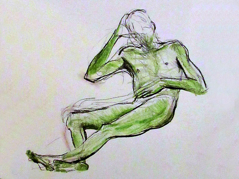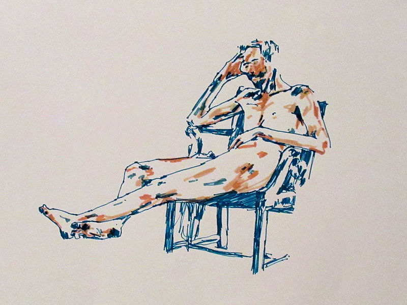 Two 10-minute poses took us to a break. For the first I perched on a low stool; for the second I lay on my back with my heels resting on the seat of a high chair; that was a new one. Democracy reigned after the interval when organiser Catherine Hall invited her dozen artists to choose between one 30-minute pose, three 10-minute poses, two 15-minute poses, or a 10 and a 20. Two 15s just shaded the popular vote. I abstained, but would have gone for the 10 and 20 myself…
