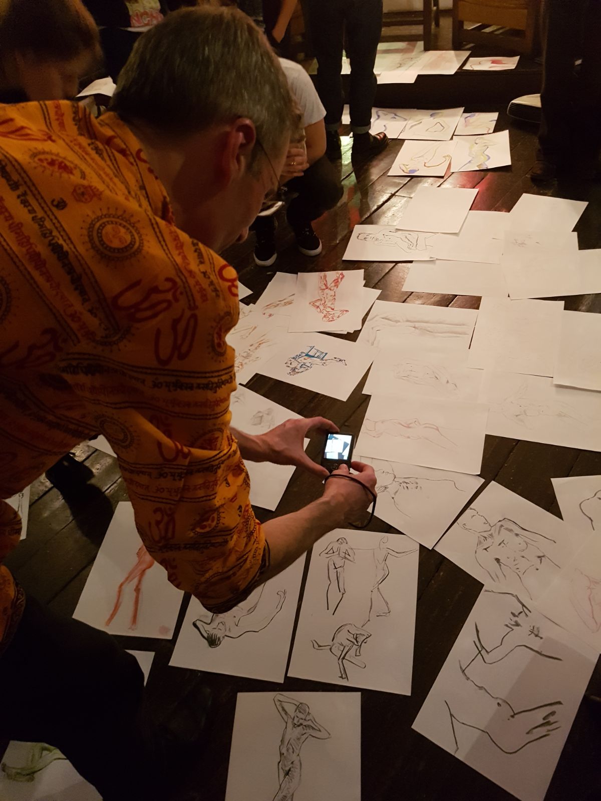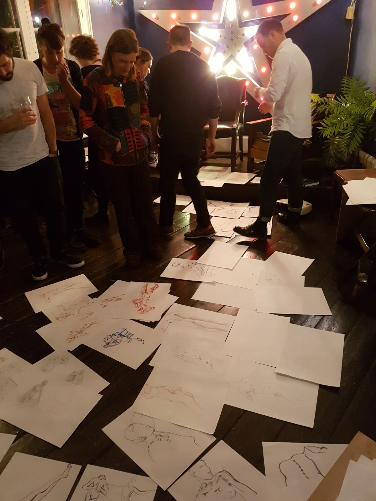 For the first 15-minutes, I stood in the round with a twisted torso and one hand held to my forehead. To finish, I settled into a throne-like chair at the rear of the room, directly in front of the pub’s eponymous bulb-lit star. In addition to affording me a rest after my earlier exertions, I thought it should be a welcome opportunity for artists to try literally ‘drawing the star’ but only one gave it a go. As ever, artworks were then spread on the floor for general admiration. Catherine captured the scene superbly in photos.