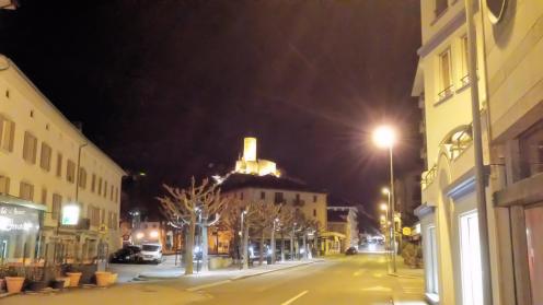 We slept soundly in our hotel room overlooked by the Alps, not least because AirBnB emailed to say they would refund the difference in price of staying there. JocJonJosch themselves were contributing to our original cost of accommodation – they are always exceptionally considerate towards their participants. The performance of ‘Footfall’ was due to begin at 6:30pm today so after an improvised breakfast we went exploring; first to Château de la Bâtiaz, which we’d seen illuminated above town the night before.