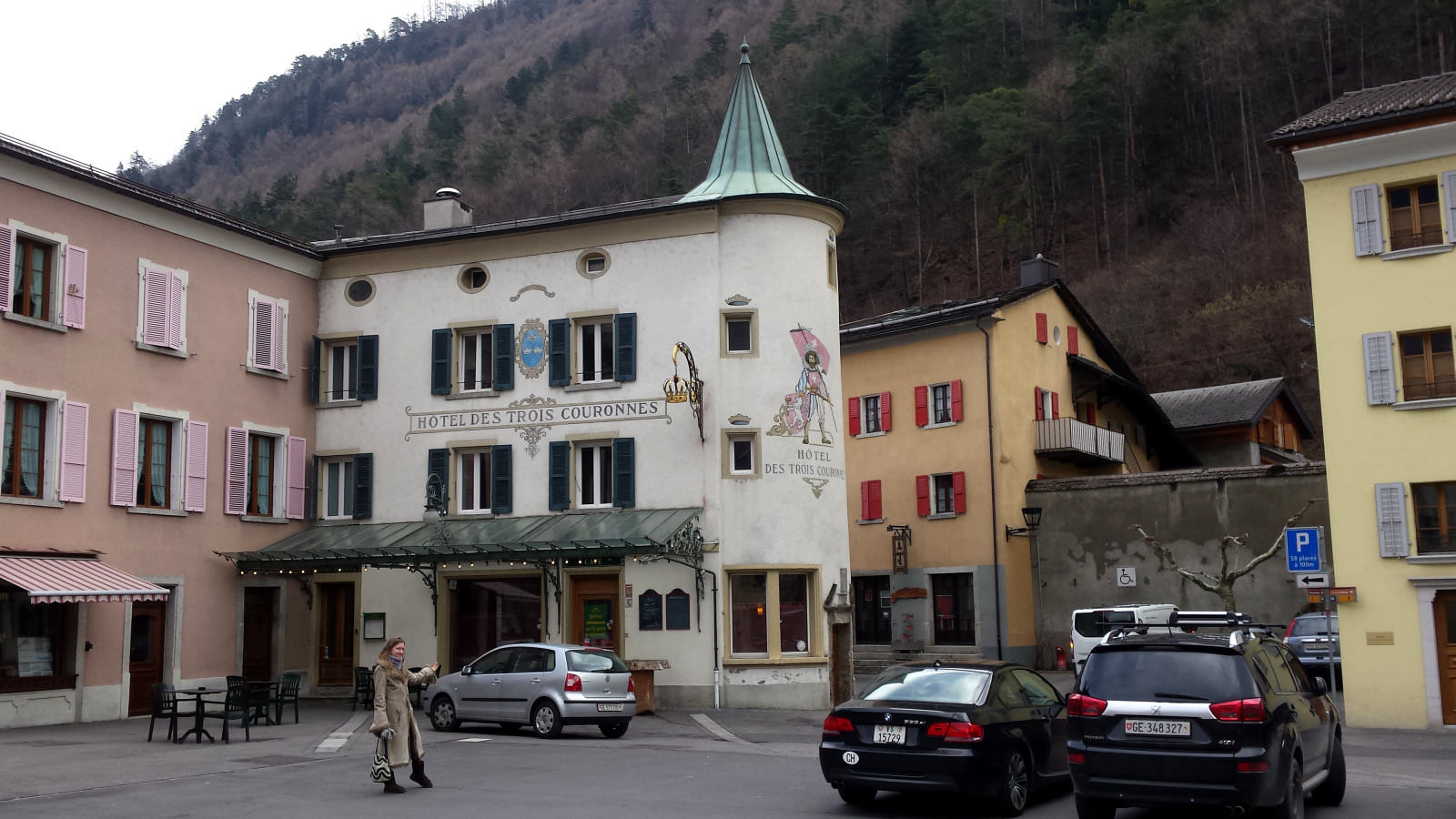 Naturally, with no-one else was about I couldn’t resist the temptation of an impromptu nude photoshoot. Esther took the shots with bemused tolerance whilst I made poses. Afterwards we wandered south to locate a seventeenth century café-restaurant called Les Trois Couronnes. This was another pilgrimage for Esther as she’d found out her parents had both dined there – entirely coincidentally – on separate visits before they were married. We dined there too: a superb meal of fresh fish and local Valais wine.