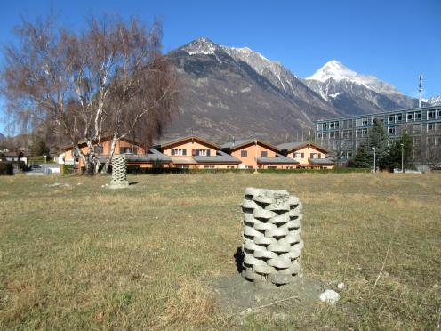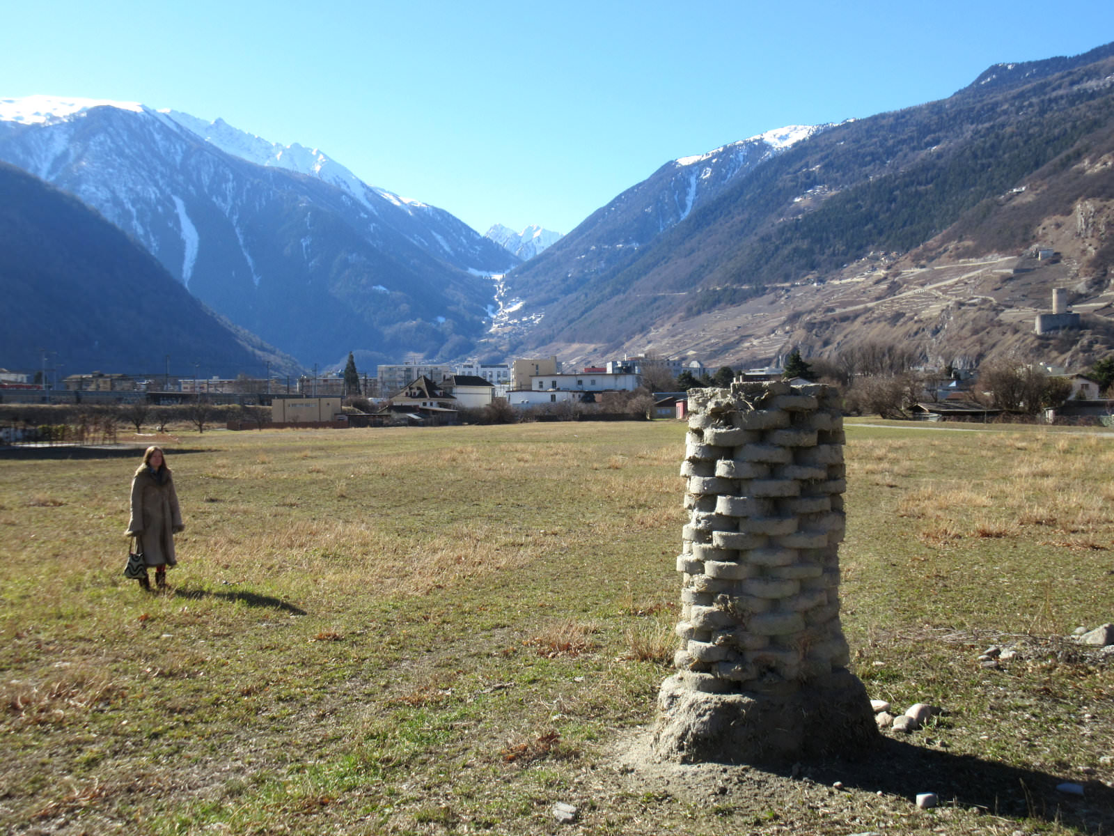 We had one final day in Martigny to unwind and chill among the mountains. Blue sky and sunshine had returned. On our way into town we stopped by the ‘Raised Totems’. I’d wanted to be photographed with them and – of course – for me there could only be one way to do it. Whereas the castle had been isolated and deserted, however, these totems were on land bordered by two hotels and a residential street. It took a while to build up courage, repeatedly checking around for passers-by, but eventually…