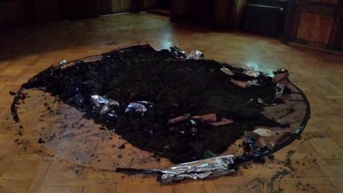It was warm, wearying work. The mud seemed to dry upon us more quickly here than in London. Single, double, triple claps were to signal half-hour intervals, but confusion reigned as the first clap was a double. The knock-on effect towards the end was it felt like we’d overrun by half-an-hour – but never mind, it made for more of an exhilarating relief when the installation was finally declared complete. Applause echoed round the room. It had been an intense and powerful shared experience.